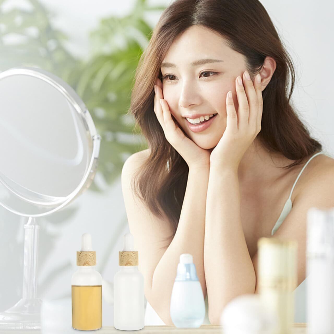 【洗練された木目調×ガラス】 ナチュラルな温もりを感じる木目調のキャップと、感あふれる**ガラス(すりガラス)**を組み合わせたお洒落なデザイン。ドレッサーやサロンのインテリアに馴染み、置いておくだけで空間を格上げします。
