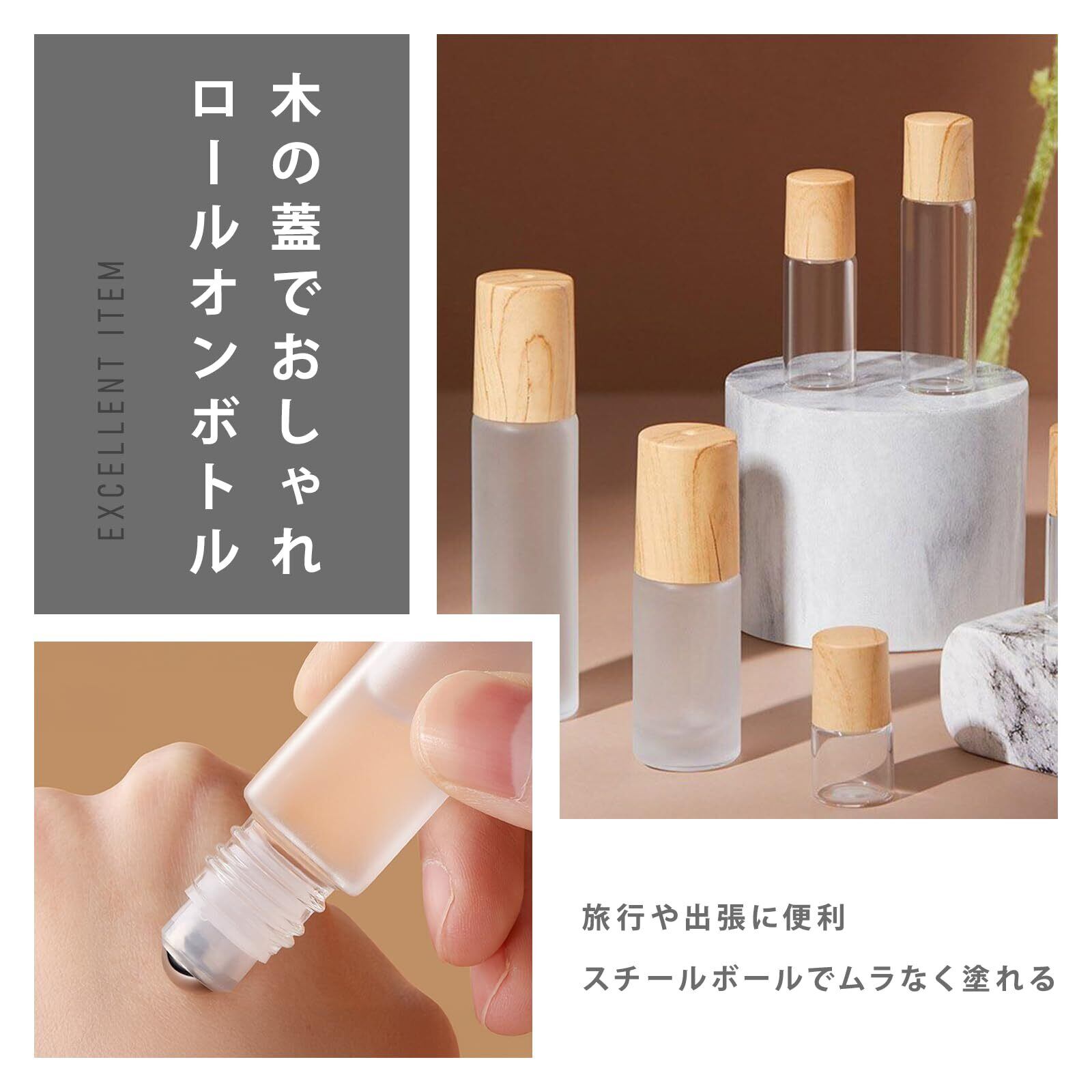 【木の蓋が可愛いアロマボトル】木目調のふたが可愛い持ち運び用のロールオンボトル10本セットです。持ち運びに便利なサイズで、キャンピング、出張や旅行などの際に携帯して頂けます。旅行の際のポケットやバッグ、化粧袋に簡単に入れることができます。