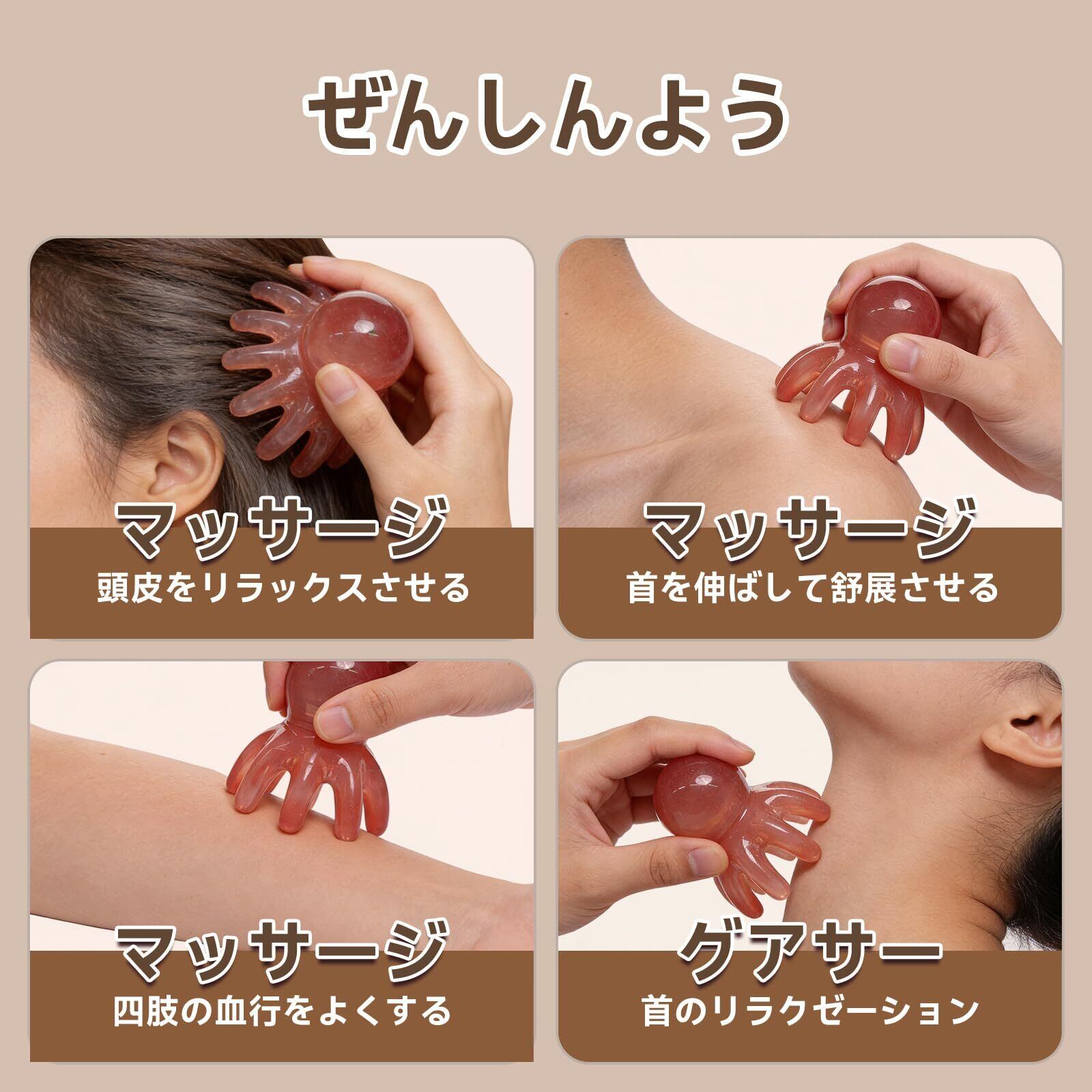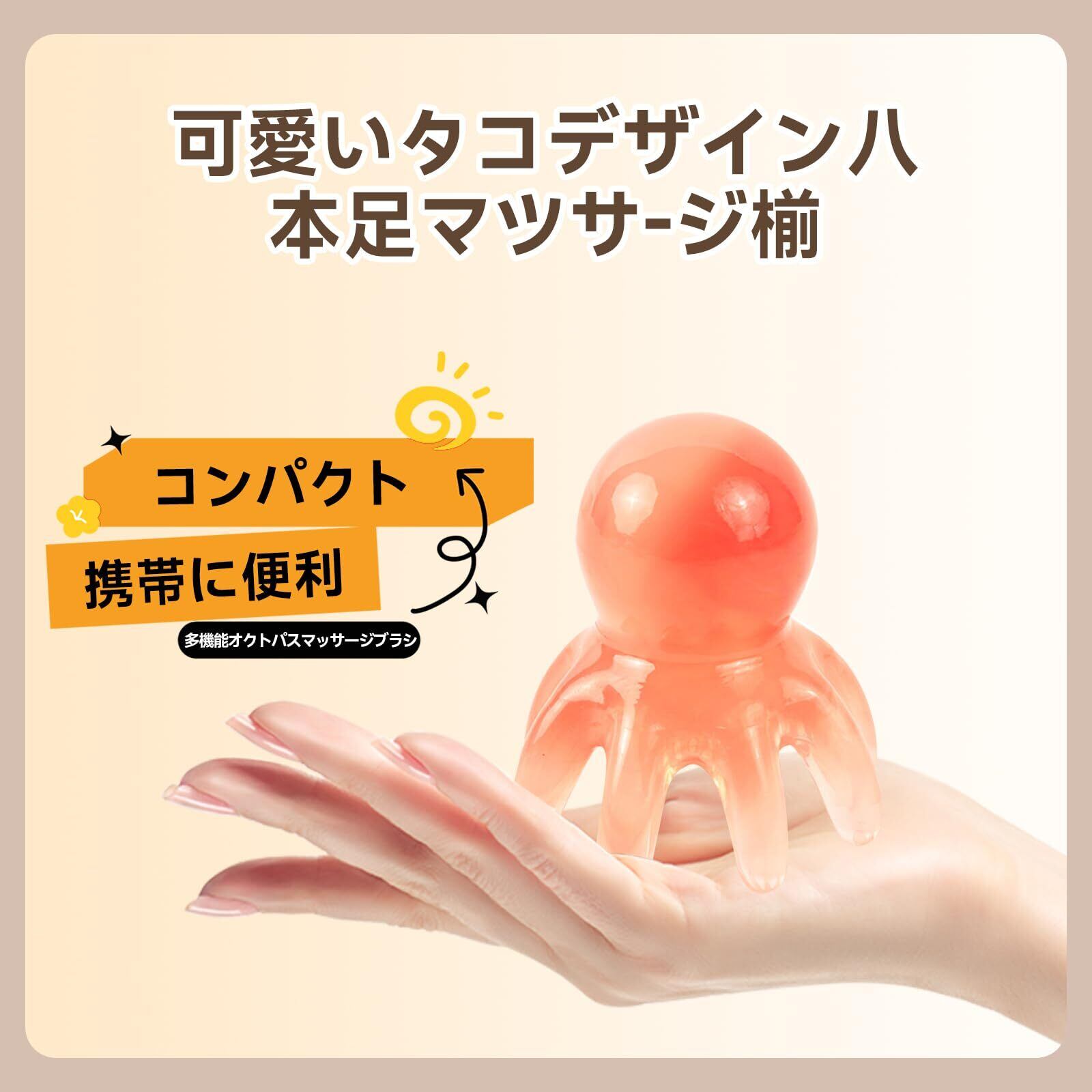 頭皮マッサージ器 8爪タコ ヘッドマッサー ジャー ヘッドスパ ハンドプロ スカルプケア 頭部 痒み止め 血行促進 ツボ押し 手動 プッシュタイプ 小型ミニおきもの 2点セット(こはくいろ)