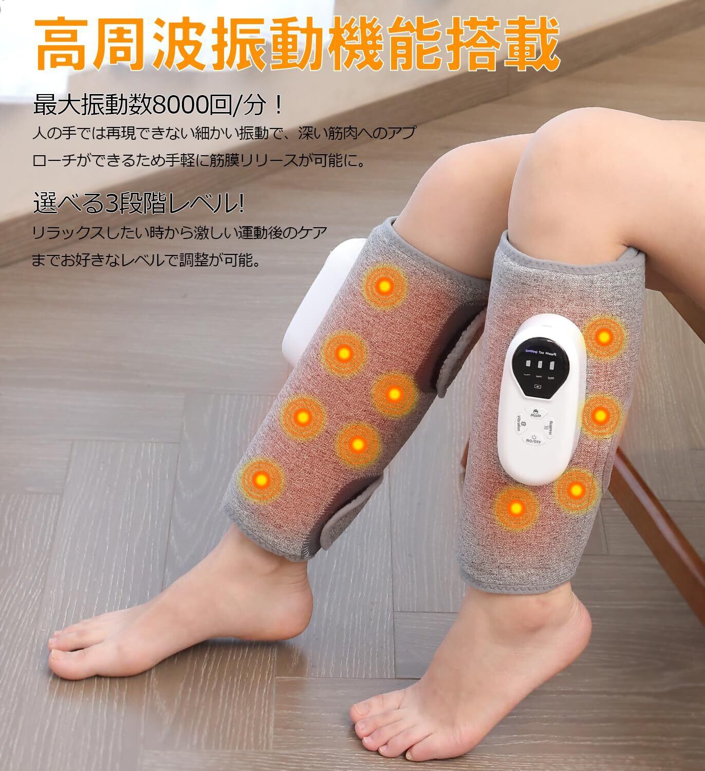 【最大振動数8000回/分】 空気圧x熱ケア x 振動の三つ機能搭載、従来品より強力で効果的にふくらはぎケア。 コンディションに合わせて選べる3段階レベル。 リラックスしたい時から激しい運動後のケアまでお好きなレベルで調整が可能。