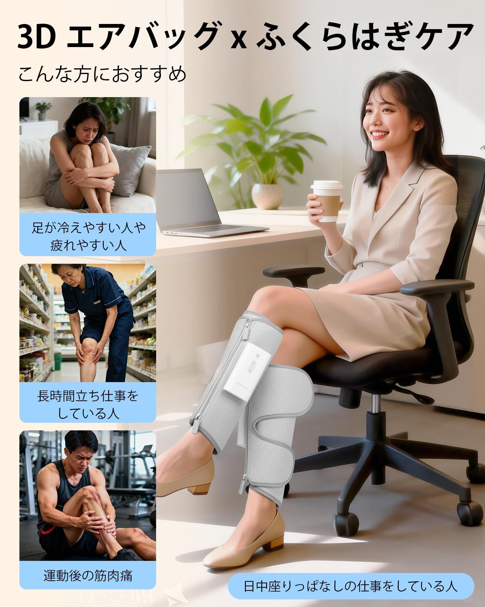 【2026新登場のEMS・エアバッグ・温熱機能3in1リラクゼーション】EMS技術、空気圧、温熱機能を融合したのは、内側から外側へと至る三重のケアを届けます。は高性能伝導シリコーン技術を特別に採用しています。これにより微弱電流がふくらはぎ筋肉により安定かつ均一に作用し、浸透力と快適性を向上させます。筋肉の活力を穏やかに活性化し、毎回のご使用が効率的なリラクゼーションと穏やかな運動を兼ね備えた体験となります。