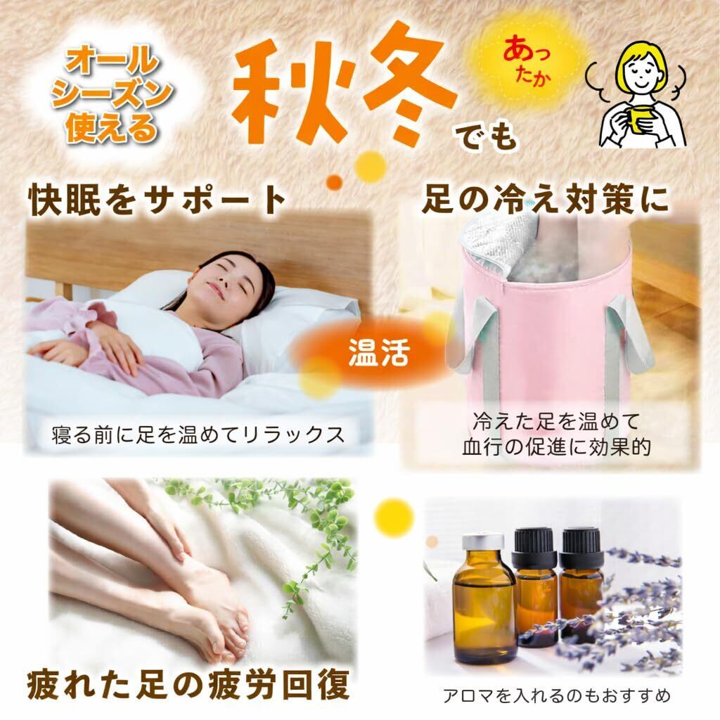 【膝丈のオールシーズン使える足湯バケツ】リラックスタイムにぴったりの足湯バケツです。寒い時期、冷え性の方には足先を温めるフットバスとして、スポーツの後にはアイシングバケツとして、洗濯物のつけ置きなど、幅広く使える万能アイテムです。