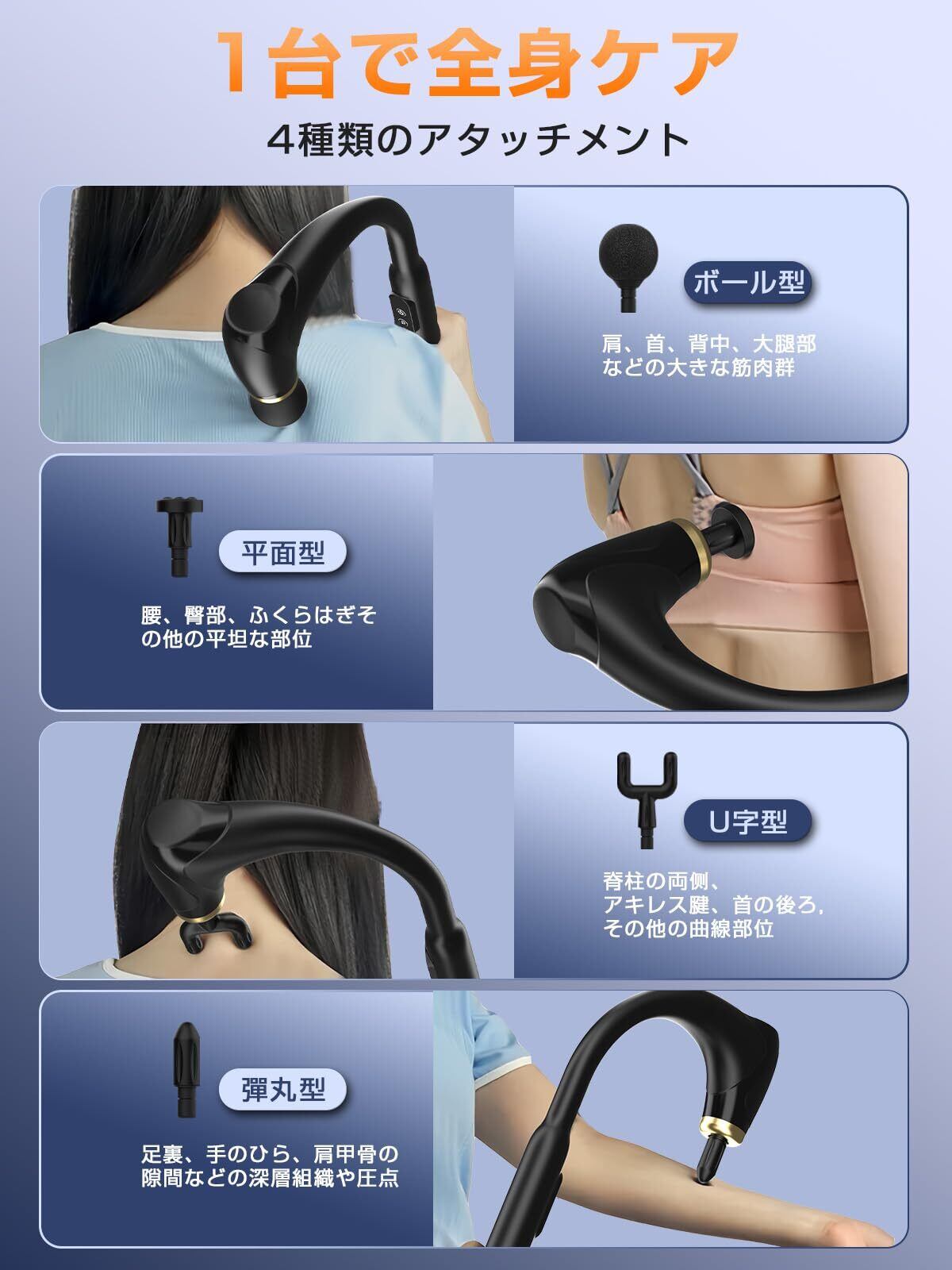 【4種類アタッチメント付き・超静音設計】リリースガンには、球形、U形、弾丸形、平形の4種類のアタッチメントが用意されており、首から足まであらゆる部位に使い分け、より高い効果を実現します。また、ミュートチップを搭載しており、動作音が45dB未満なので、早朝や夜間など、時間を気にせず使うことができます。さらに、双チュアベアリングを採用し、手振れを抑えて安定した使用が可能です。仕事中や運動中でも全くストレスなく使用できます。きんまくリリースの音が大きすぎて他人に迷惑をかけることを心配する必要はありません。洗練されたデザインと実用性の高さは、友人、上司、親戚、両親、そして高齢者にも喜ばれる理想的なギフトとなるでしょう。万が一、製品には不具合があったら、までご連絡ください。アカウントサービス内の「アカウントサービス」→「注文履歴」→「販売元」→「質問する」