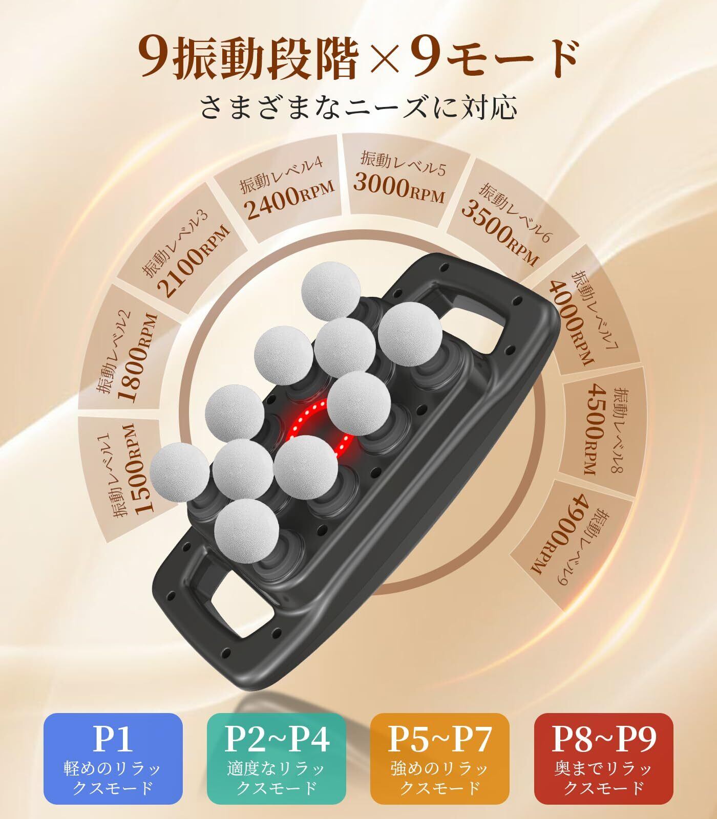【9 モード ×9 段階&計 81 パターン】筋膜ガンは、使用シーンや好みに合わせ、9 種のモード ×9 段階の設定を自由に選択できる本格カスタマイズシステムを搭載しています。振動の強さは 1500~4900 回転 / 分(計 81 パターン)まで幅広く調整可能で、様々なニーズに応じて最適な設定に変更できます。この きんまくリリース電動ガン は、近赤外線温熱技術を搭載。振動と温感の相乗効果で、筋肉の深部までしっかりケアし、心地よいリラックス感を体感できます。さらに赤外線温熱機能を強化することで、より充実したリラックス体験をお届けします。