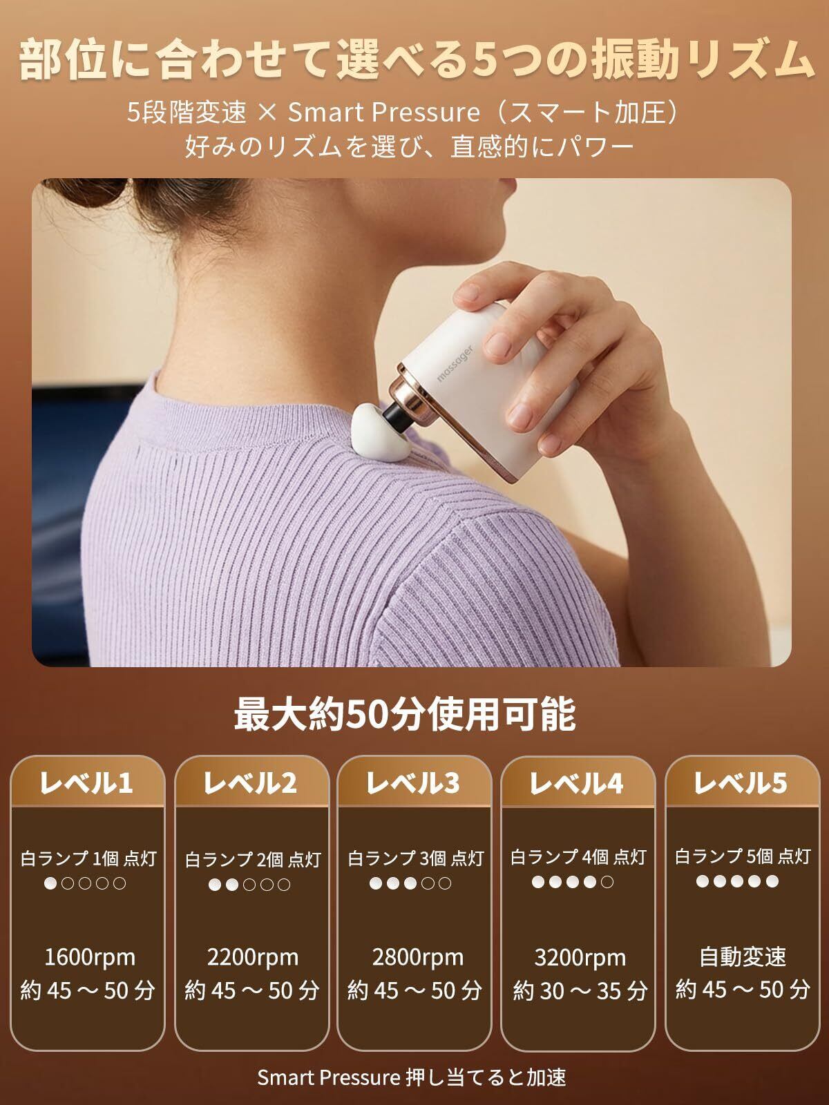 【5段階変速&AIスマート変頻機能】 ボタン一つで5段階の振動レベルを調節可能。さらに、ボディに押し当てる強さを感知して、自動的に振動リズムを調整する「AIスマート変頻技術」を搭載しました。軽く当てれば優しく、強く押し込めば高速でパワフルに。面倒なボタン操作をすることなく、強弱を直感的にコントロールでき、メリハリのあるケアを実現します。5つのLEDランプで現在のレベルも一目で分かります。