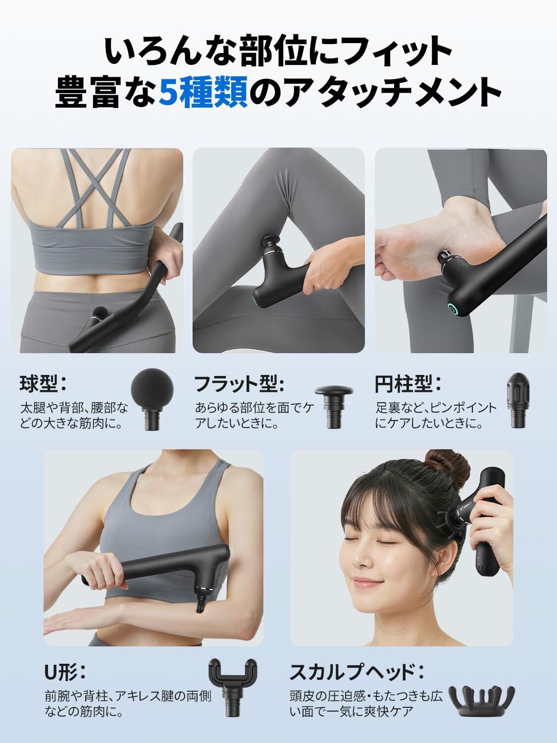 【5種類のアタッチメント&頭皮までリラックス!】球型、フラット型、円柱型、U型、シリコン素材のスカルプヘッドの5種類のアタッチメントが付属しており、さまざまな部位に対応できます。頭皮から足先まで、ケアしたい部位に合わせて使い分けでき、よりフィットしたケアが可能です。スカルプヘッドは頭皮をやさしく刺激し、圧迫感やもたつきを広い面で一気にリフレッシュ。こわばりがちな頭皮を心地よくほぐし、忙しい毎日のボディケアをサポートします。