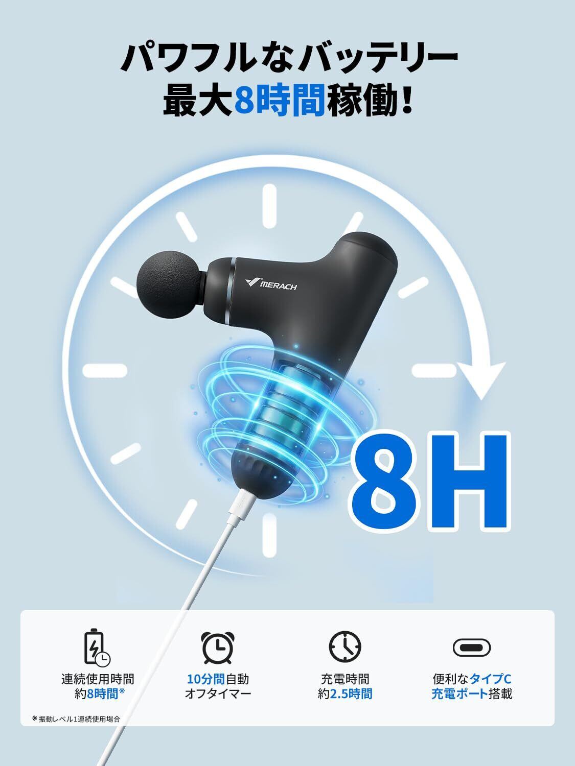 【最大8時間連続使用&1年メーカー】1200mAhバッテリーを2本内蔵した大容量設計のハンディガン。Type-C充電対応の充電式で、場所を選ばず、日常のボディケアや健康的な身体づくりをサポートします。さらに、10分自動オフタイマー機能と安全保護機能を搭載し、安心して使用できます。本リリースガンは1年メーカーが付いています。万が一の不具合やご質問があれば、どうぞお気軽にご連絡ください。お客様のフィットネスライフをより充実させるため、全力でサポートいたします。