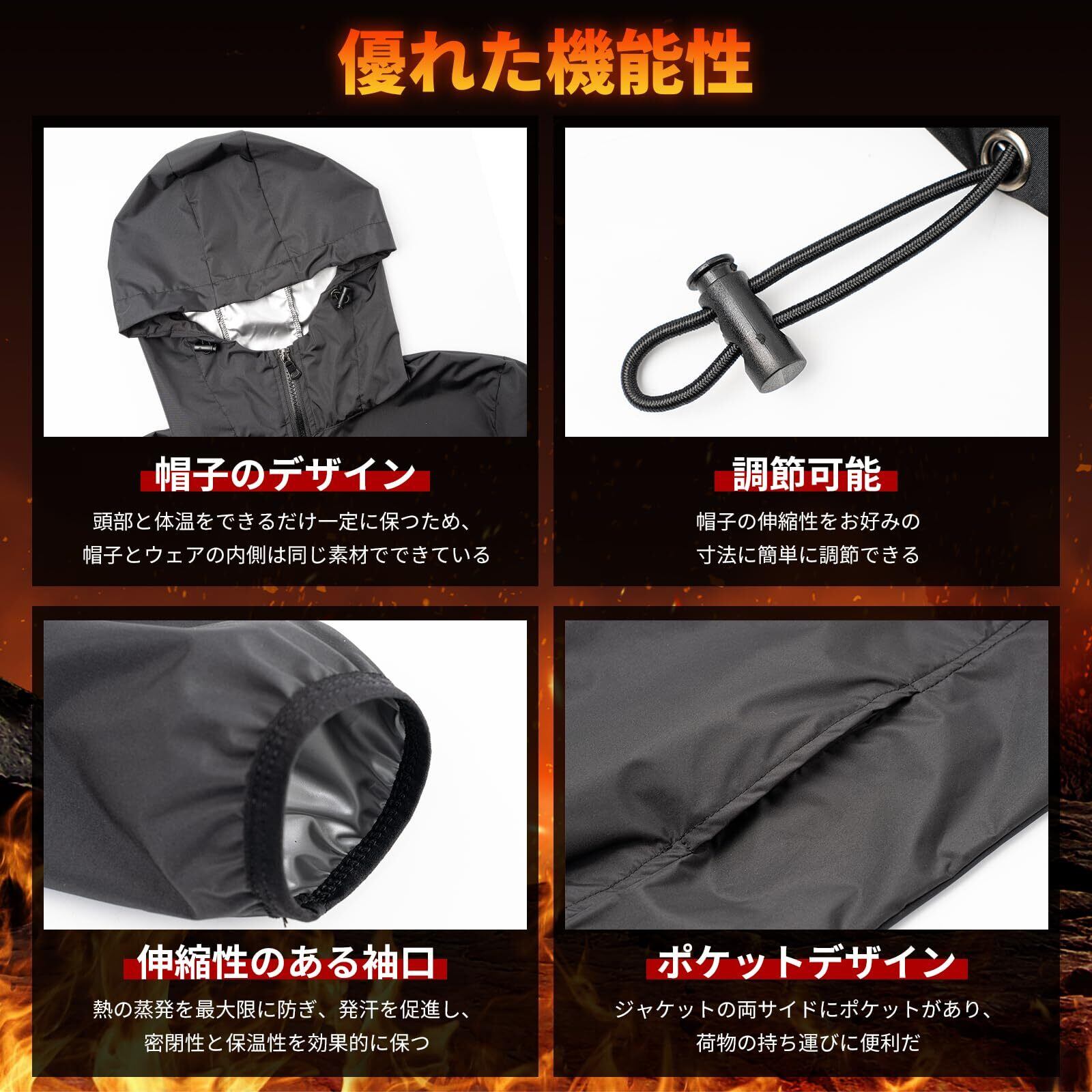 【ユニークなデザイン】サウナスーツはユニークなデザインを採用します。帽子の内側は衣服と同じヒートラップ素材で作られており、頭と体の温度をできるだけ一定に保つことができます。袖口はシュリンクデザインを採用し、熱の蒸発を最大限に防ぎ発汗を促します。 2つのポケットにより、アイテムの持ち運びや移動が簡単になります。