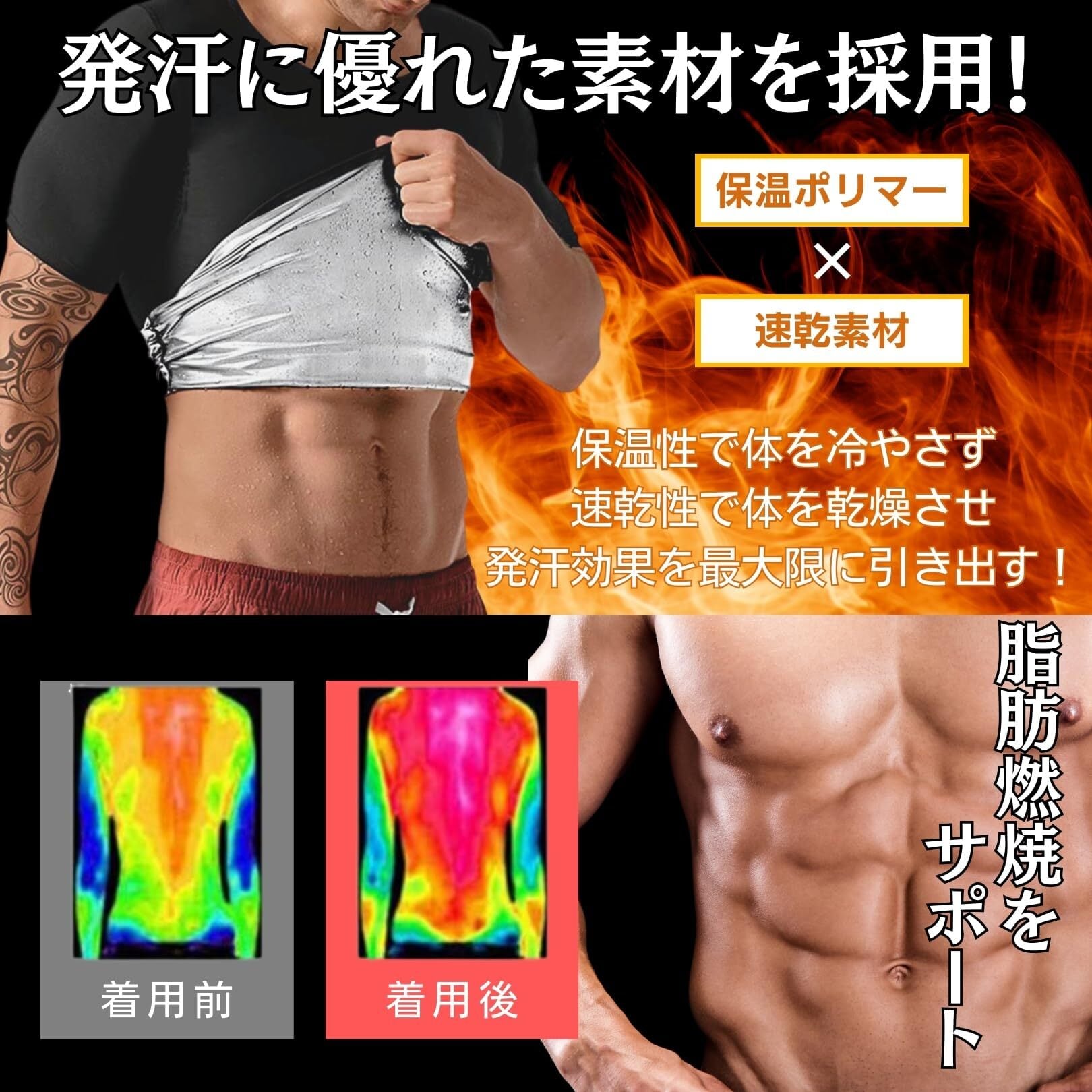 このサウナスーツは、運動中の発汗を促進し、短時間で効率的にカロリーを消費します。特にランニングやトレーニング時に着用することで、通常の運動よりも高い発汗効果を実感できます。
