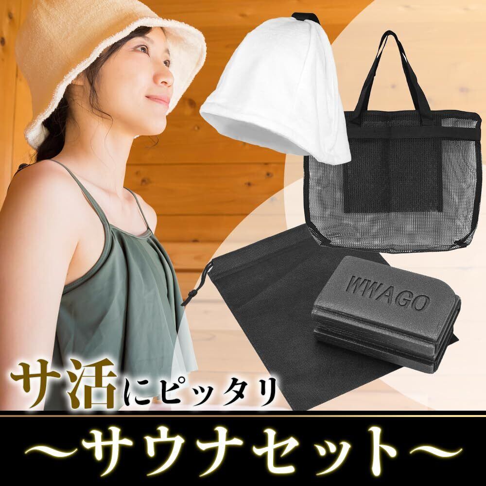 サウナのマストアイテム3点セットをまとめてお届け!個別に買う手間を省き、すぐに「サ活」できる便利セットです。サウナハット・折り畳みマット・収納バッグとマットを収納できる収納袋のセットです。