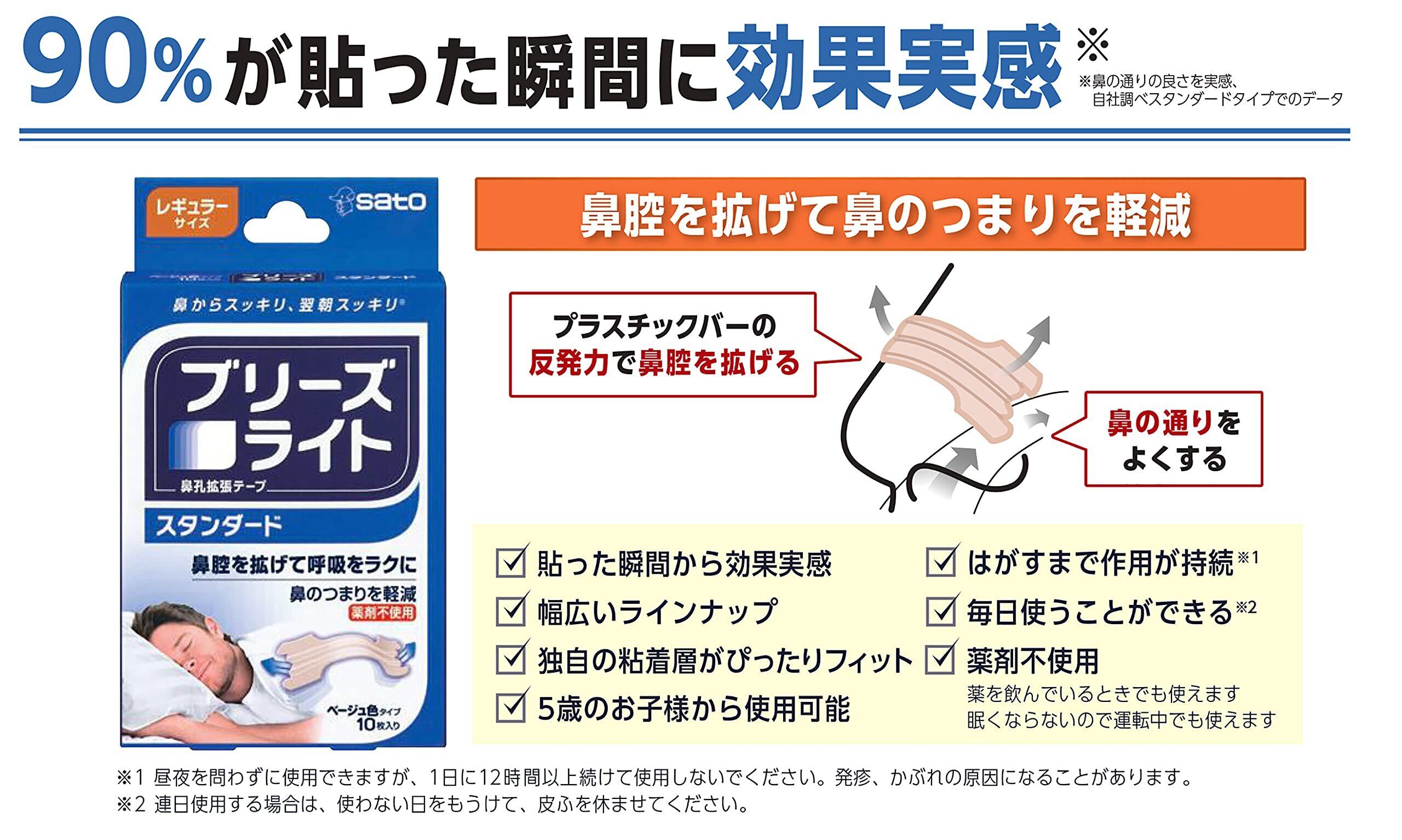 【商品説明】 「ブリーズライト スタンダード 肌色 レギュラー」は、プラスチックバーの反発力で鼻腔を拡げて、鼻のとおりをスムーズにします。鼻がつまって寝苦しく、良く眠れないとき、鼻の上に貼るだけで鼻の呼吸をサポートします。 鼻からスッキリ、翌朝スッキリ*。 *ブリーズライト鼻孔拡張テープは、あなたの呼吸をラクにし、快適な睡眠をサポートします。 【製品特長】 ・プラスチックバーが、鼻をやさしく持ちあげ鼻腔を拡げます。 ・ブリーズライト独自の粘着層が、ぴったりフィットします。 ・通気率を最大31%アップ* ・いびきを軽減します。 *自社調べ、貼らない時との比較 【使用上の注意】 ・使用に際しては、添付の説明書をよく読んでください。 ・本品は、鼻腔を広げるため鼻の表面に装着するテープです。本来の目的以外に は使用しなでください。 ・5歳未満のお子様には使用しないでください。 ・キズ、湿疹、日焼け、かさつきなど皮膚に以上がある場合は使用しないでください。 ・本品の使用によって睡眠時無呼吸症候群が緩和されることはありません。 ・昼夜を問わずに使用できますが、1日12時間以上続けて使用しないでください。発疹、かぶれの原因になることがあります。 ・本品をはがす時は、ぬるま湯などで充分ぬらしてからゆっくりとはがしてください。 ・本品は粘着剤に天然ゴムを使用していません。本品を包んでいるシート(包み紙)には天然ゴムを接着剤として使用していますので、天然ゴムアレルギーの方は シート(包み紙)の接着剤に触れないようにご注意ください。 【使用方法】 1:鼻をよく洗って乾燥させます。 2:中央を鼻の中心に合わせ、ブリーズライトの両側をみつけた位置に合わせます。 3:両側を鼻にそって曲げて、指でさすってしっかりと接着させます。 【お問い合わせ先】 輸入販売元:佐藤製薬株式会社(製品の問合せ先:03-5412-7393) 安全警告 ●ご注意:●使用に際しては、添付の説明書をよく読んでください。 ●本品は、鼻腔を拡げるため鼻の表面に装着するテープです。本来の目的以外には使用しないでください。 ●5歳未満のお子様には使用しないでください。 ●キズ、湿疹、日焼け、かさつきなど皮膚に異常がある場合は使用しないでください。 ●本品の使用によって睡眠時無呼吸症候群が緩和されることはありません。 ●昼夜を問わずに使用できますが、1日に12時間以上続けて使用しないでください。発疹、かぶれの原因になることがあります。 ●本品をはがす時は、ぬるま湯などで充分ぬらしてからゆっくりとはがしてください。 ●本品は粘着剤に天然ゴムを使用していません。本品を包んでいるシート(包み紙)には天然ゴムを接着剤として使用していますので、天然ゴムアレルギーの方は、シート(包み紙)の接着剤に触れないようご注意ください。 ご注意(免責)>必ずお読みください こちらの商品はポスト投函(追跡あり)での発送になります。盗難、箱つぶれ等のがございません。あらかじめご了承ください。