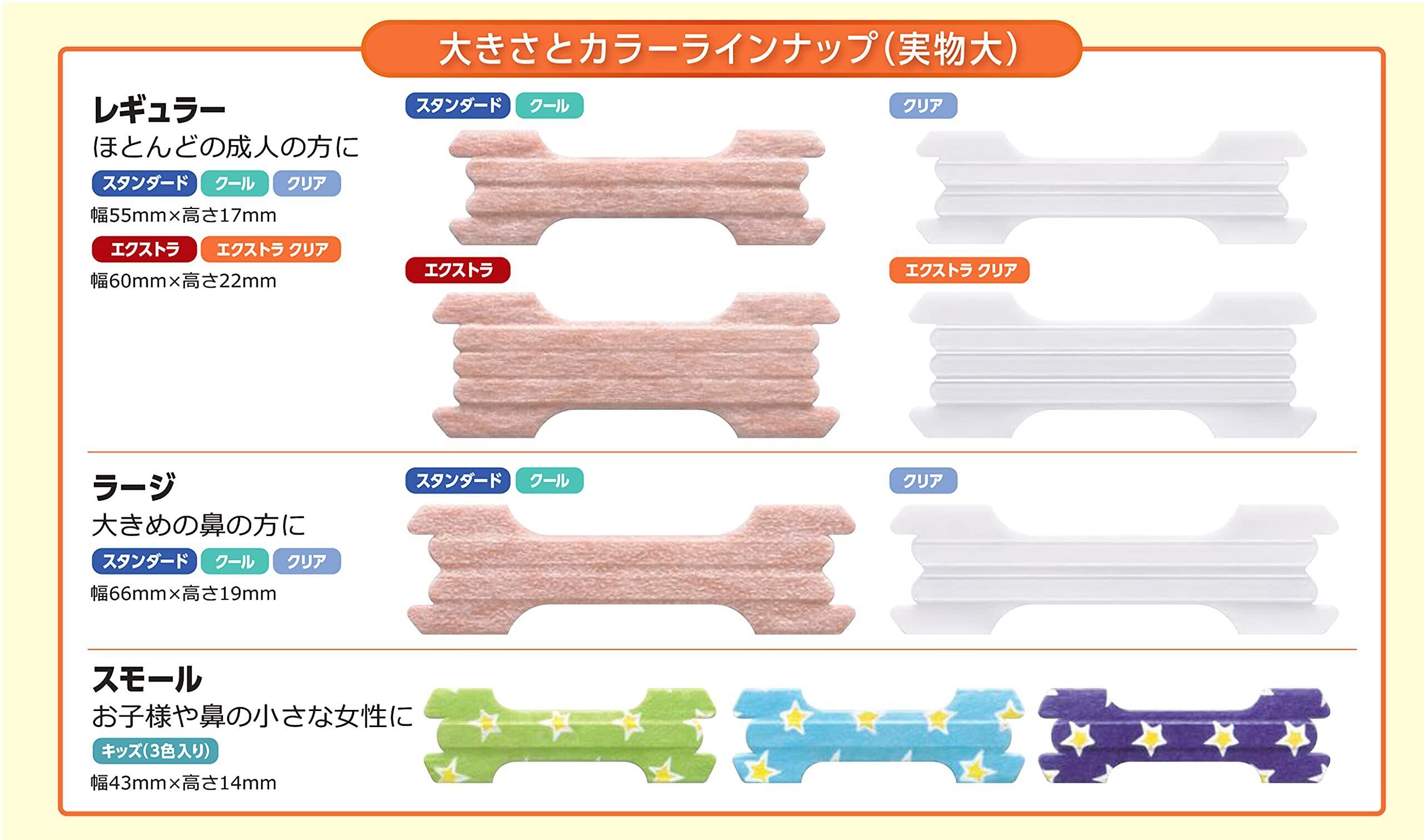 ●ご注意:●使用に際しては、添付の説明書をよく読んでください。 ●本品は、鼻腔を拡げるため鼻の表面に装着するテープです。本来の目的以外には使用しないでください。 ●5歳未満のお子様には使用しないでください。 ●キズ、湿疹、日焼け、かさつきなど皮膚に異常がある場合は使用しないでください。 ●本品の使用によって睡眠時無呼吸症候群が緩和されることはありません。 ●昼夜を問わずに使用できますが、1日に12時間以上続けて使用しないでください。発疹、かぶれの原因になることがあります。 ●本品をはがす時は、ぬるま湯などで充分ぬらしてからゆっくりとはがしてください。 ●本品は粘着剤に天然ゴムを使用していません。本品を包んでいるシート(包み紙)には天然ゴムを接着剤として使用していますので、天然ゴムアレルギーの方は、シート(包み紙)の接着剤に触れないようご注意ください。
