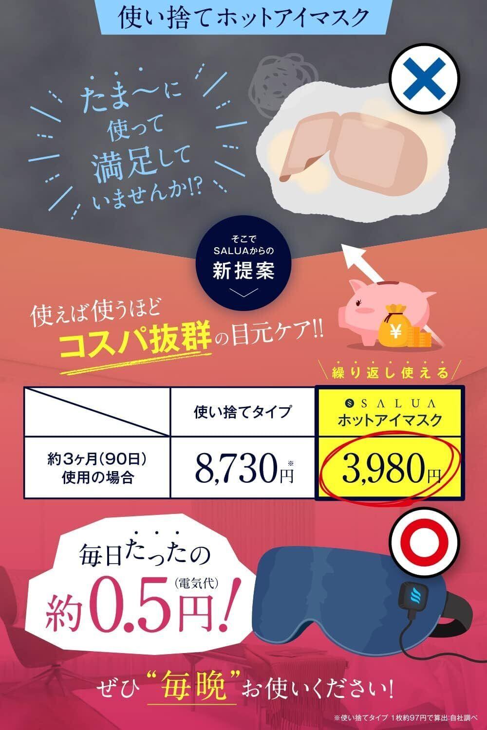 【使いやすい コードレス でストレスフリー】 安眠 や目の疲れなどに使いたい ホットアイマスク 。実は ホット アイマスク の約9割がコード付きなので「コードが邪魔になる…」「重い…」とストレスになることも。そんな悩みに応えて開発されたのがSaluaの ホットアイマスク コードレス 。ストレスフリーなのはもちろん、薄型ヒーター採用で74gの超軽量!余計なイライラを感じることなく、リラックスできます