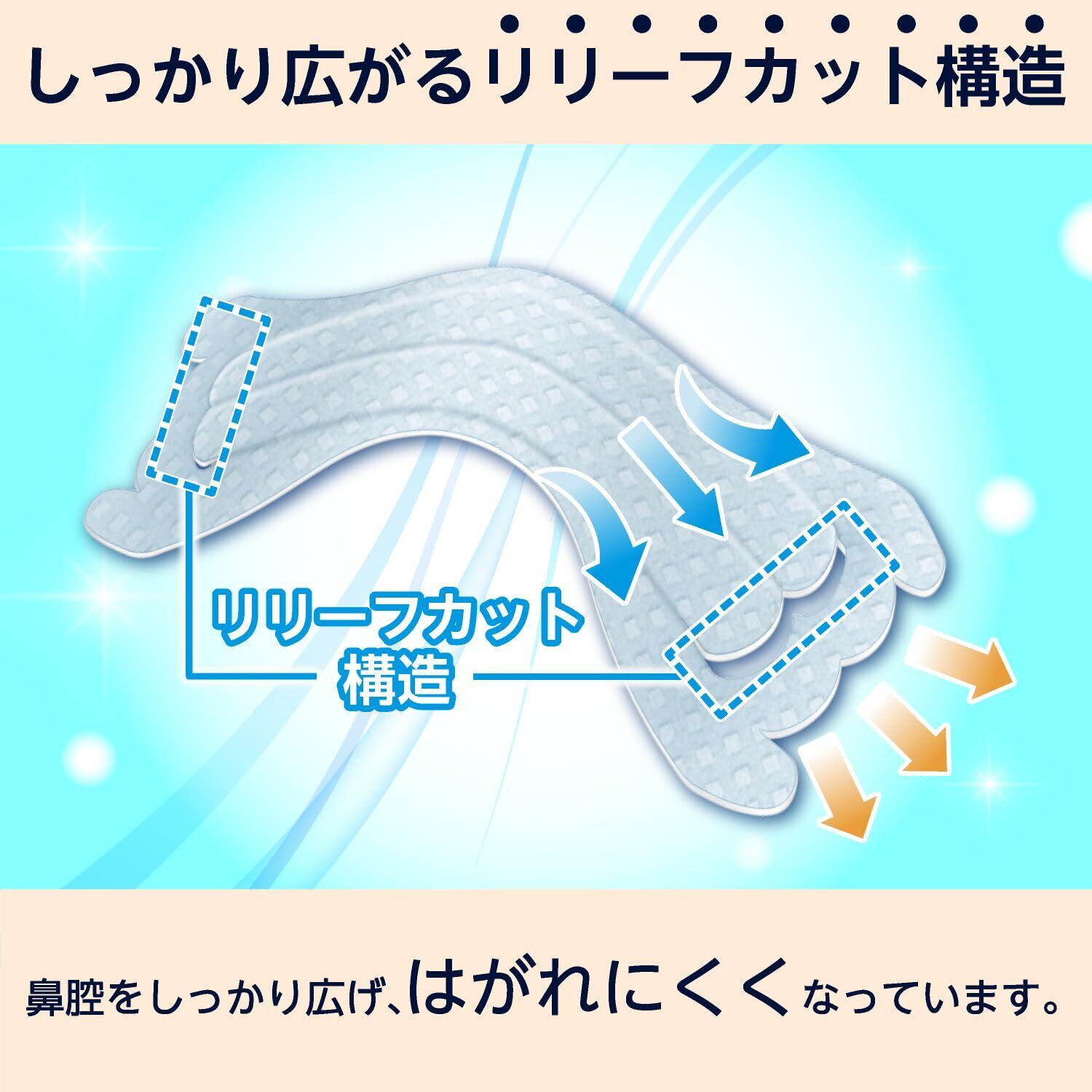 2.リリーフカット構造により、しっかり広がり、はがれにくくなっておりますので、 就寝時やスポーツ時にもご使用いただけます。