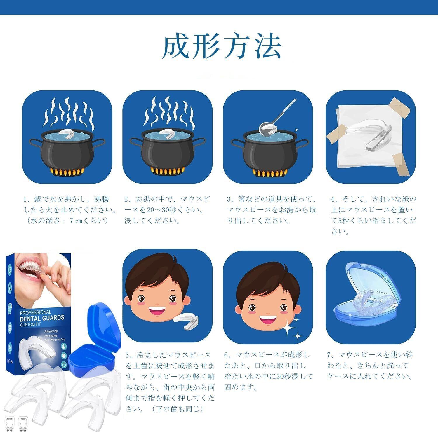【型取り必要】歯ぎしりの作り方は、お湯に入れて柔らかくして歯型に合わせて型を取るだけ、とても簡単です。自分の歯形で成型するからフィット感抜群、違和感なし。作り直し、微調整が可能なので就寝中も外れません。