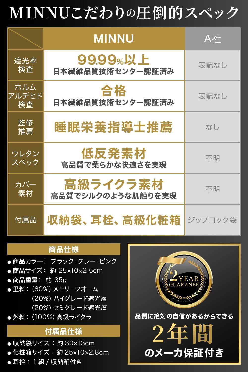 【2年メーカー×60日間返品】2年間の国内メーカーを提供しています。万が一故障が発生した場合は交換対応いたします。また、60日間の返品も提供しており、購入者の個人的な理由(例えば商品が期待と異なるなど)でも返品を受け付けます。※を受けるには、購入時の注文番号が必要です。●【商品仕様】素材:高級ライクラ×低反発50Dメモリーフォーム、アイマスク重量:約35g、アイマスクサイズ:約25x10x2.5cm。●カラー:ブラック/グレー/ピンク。●化粧箱サイズ:25x10x2.8cm。●【付属品】耳栓、アイマスク収納袋、プレゼントにも最適な高級化粧箱。●【パッケージリニューアル】新パッケージに順次リニューアル中!パッケージはお選びいただけませんのでご了承ください。中身の品質はそのまま、変わりはありませんのでご安心ください。