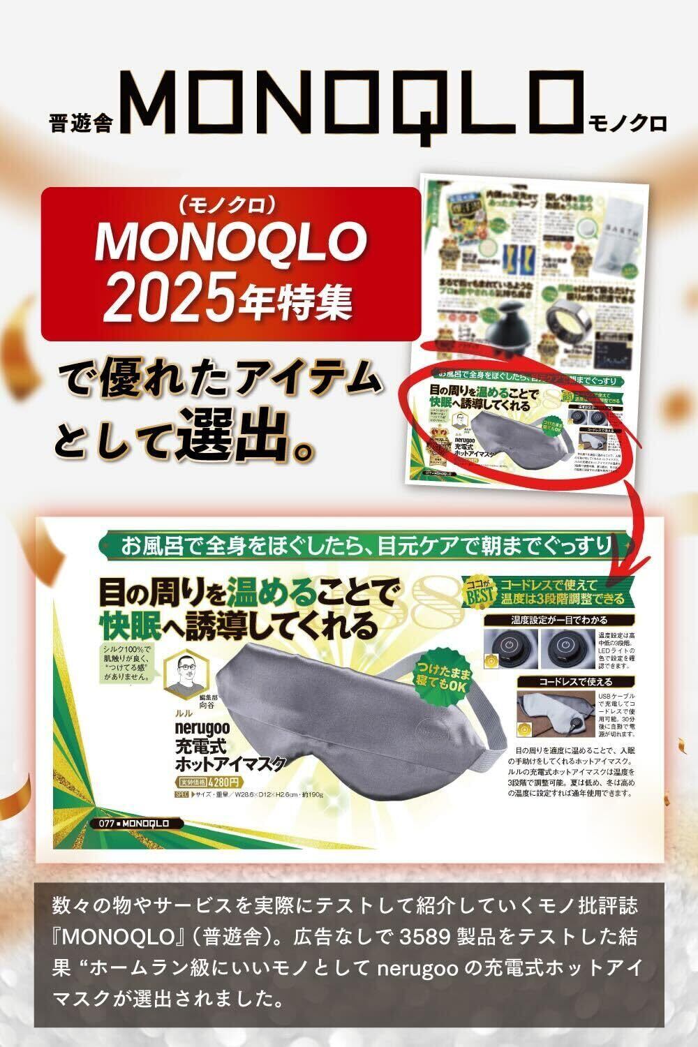 【快眠設計×高品質素材】2023年グッドデザイン賞受賞。金具やボタンを排し、独自素材「nerugoo SILK」で肌に吸い付くような心地よさを実現。敏感肌の方にも優しいアイマスク ホット。