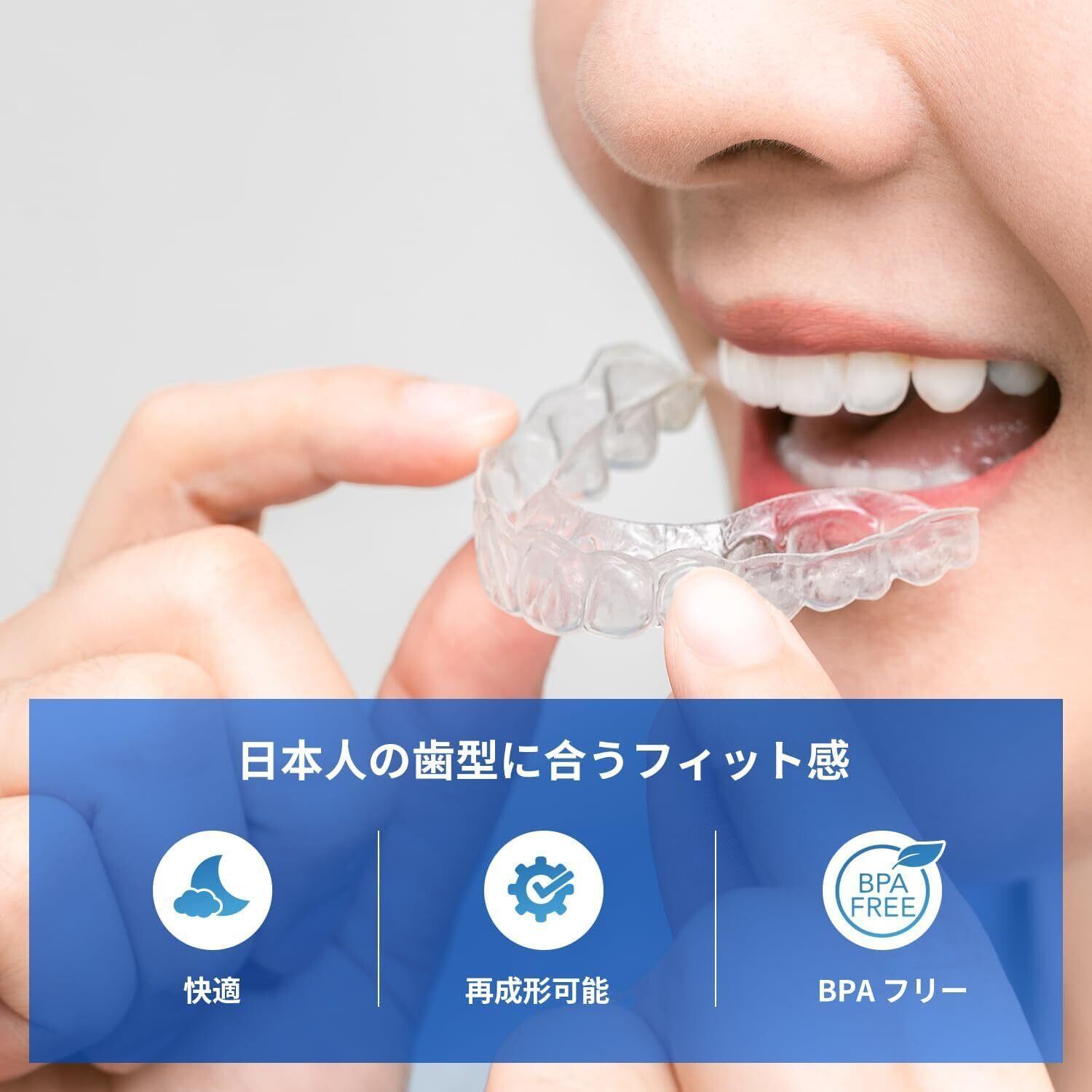 【自分の歯に合わせて成形】このマウスピースの大きな特長はご自身の歯形に合わせて成形できる点です。お湯に入れてやわらかくし、歯に合わせて完全にフィットさせることであなた専用のマウスピースが完成します。自分の歯型に合わせて成型をおこなうので、装着時の違和感がほとんどなく、就寝中もずれや外れの心配がありません。歯ぎしり マウスピース、あなただけのオーダーメイド感覚で、快適なナイトケアを実現します。