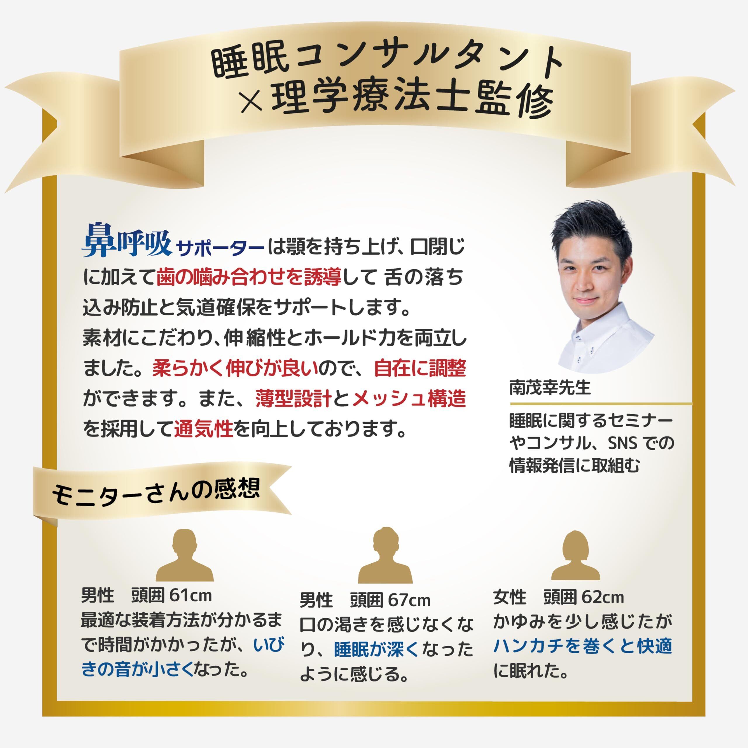 【サイズ】あごから頭頂部までの頭囲を測ってください。顎バンドの適合サイズは頭囲57~70cmです。サイズがぎりぎりになったり、合っていないと効果が出づらくなるのでご注意ください。サイズに関するご不明点はお気軽にお問合せください。