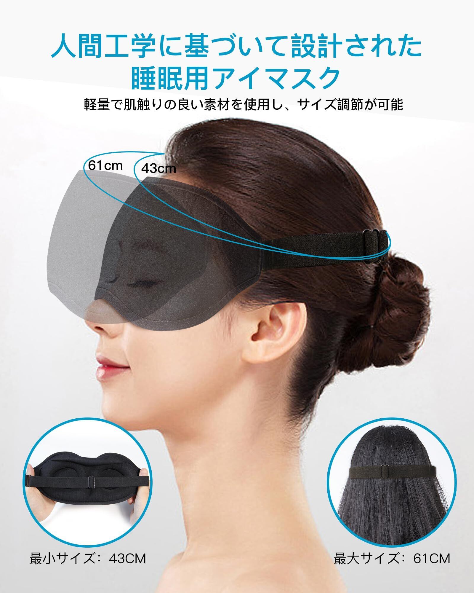 【アイマスク 立体サイズ調整可能】 の3dアイマスクは頭囲43~61cmまでサイズ調整可能で、大人から子供までご利用いただけます。耳掛け式やマジックテープ式とは異なるため、耳が痛くなったり、髪の毛が絡まったりすることがありません。 また品質の良いゴムバンドを採用しており、睡眠用アイマスク中にずれたり外れたりしにくくなっています。