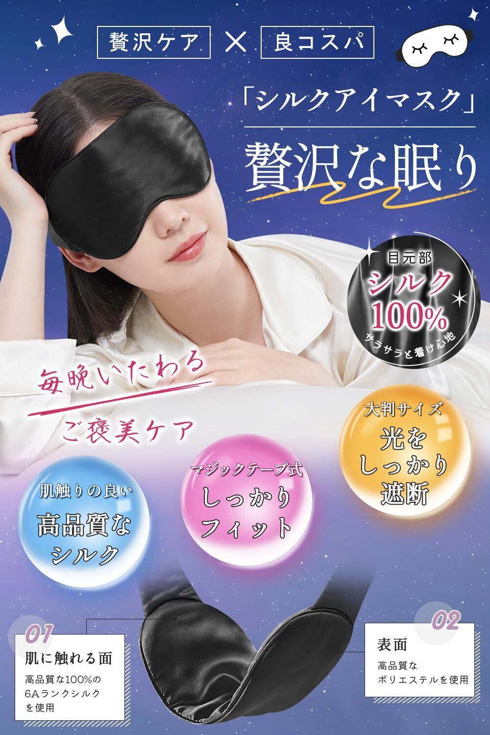 素材の特徴 目元100%シルク+表面100%ポリエステル