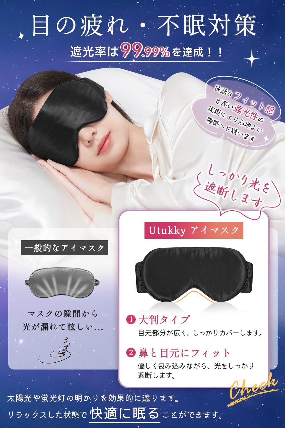【高い遮光性・快眠サポート】Utukkyシルクアイマスクは、隙間ができない大判タイプで、目元部分の生地面積を広めに設計しました。これにより、鼻と目元がぴったりフィットし、優しく包み込まれることで光をしっかり遮断します。遮光率99.99%で太陽光や蛍光灯の明かりを効果的に遮り、リラックスした状態で眠ることができます。上質な天然シルク生地を使用。熱加工によりメラトニンの分泌を促進し、より深く良質な睡眠へと導きます。いつでもどこでも、光に邪魔されることなく快適な睡眠をお楽しみください✨
