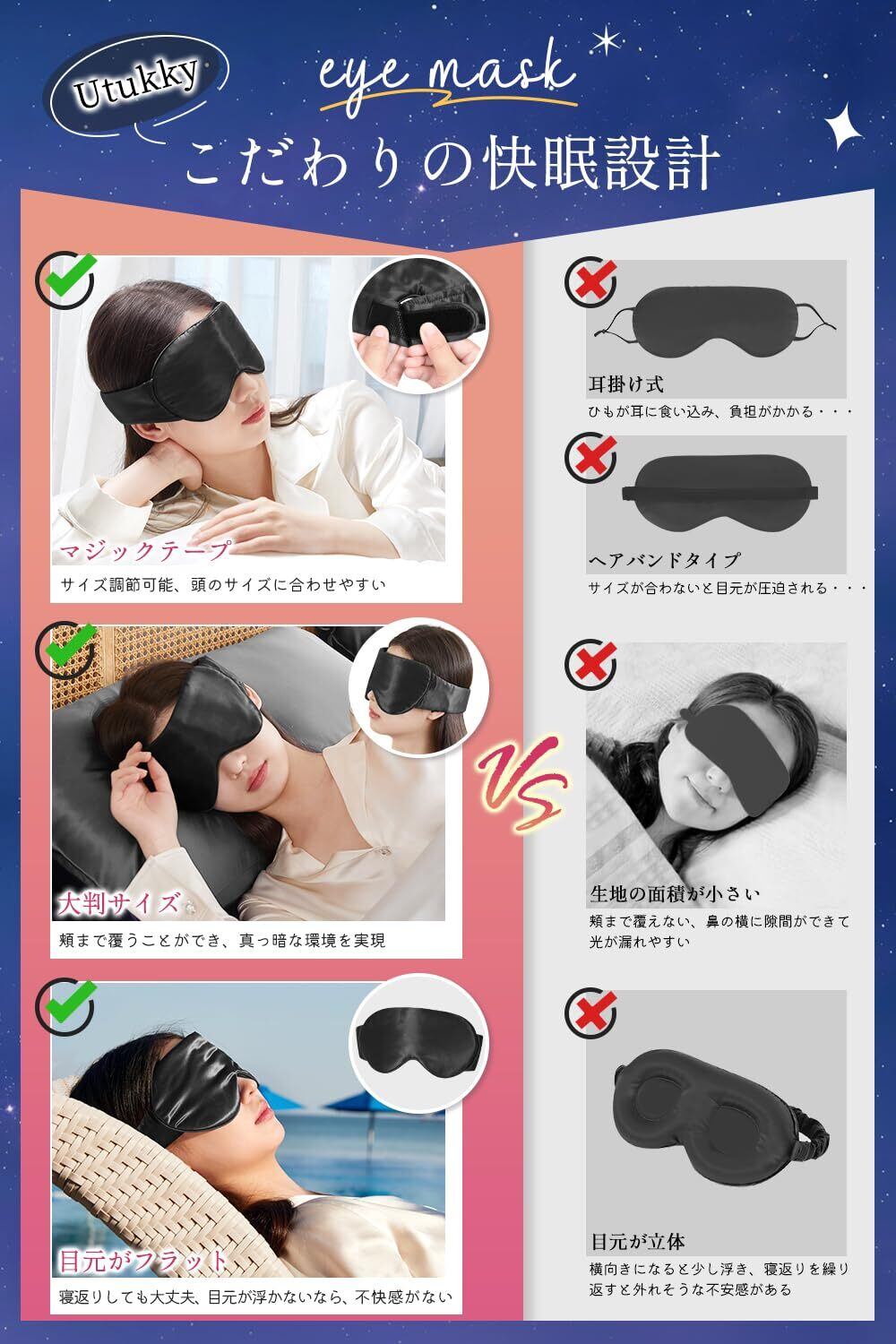 【長さ調整可能・圧迫感ゼロ】アイマスク使用時に「目や耳が圧迫されてストレスを感じる」というお悩みをお持ちではありませんか?Utukkyアイマスクは、皆様のご意見を反映し、マジックテープ式にアップグレードしました。これにより、長さ調整が可能になり、顔や頭のサイズに合わせて自由に調整できるため、男女問わずストレスなくご使用いただけます。さらに、耳にかける部分は幅広設計で、負担を軽減し、ぐっすりお休みいただけるよう配慮されています。装着時に耳が痛くなりにくく、跡もつきにくいのが特徴です。