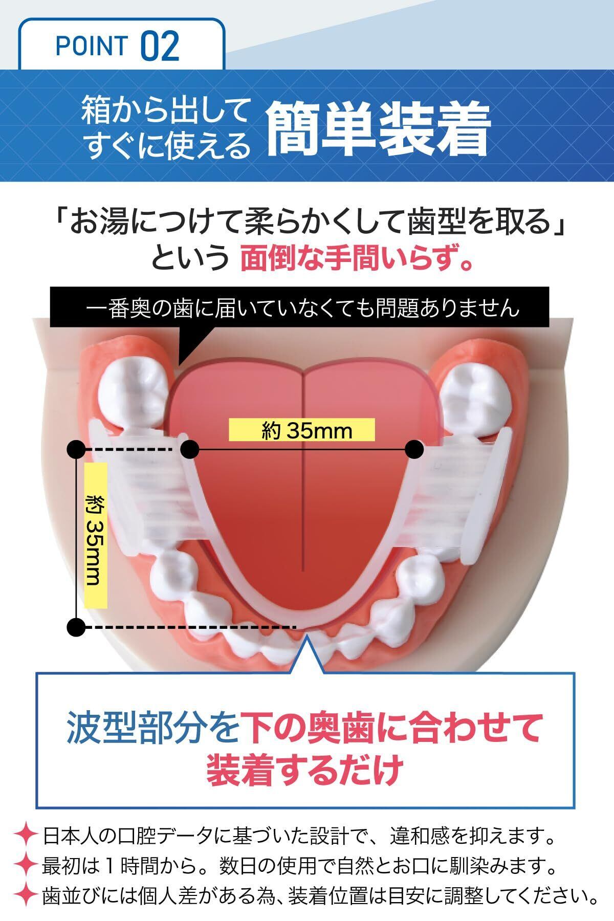 【型取り不要】 届いてすぐに使えるシンプル設計。やわらかいシリコン素材で、奥歯に合わせるだけのピンポイント設計。接触面が少なく、痛みや違和感を感じにくいシンプル&快適設計です。