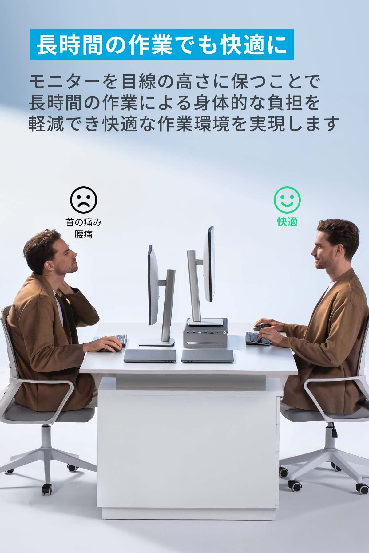 長時間の作業でも快適に:モニターを目線の高さに保つことで長時間の作業による身体的な負担を軽減することができ、快適な作業環境を実現します。