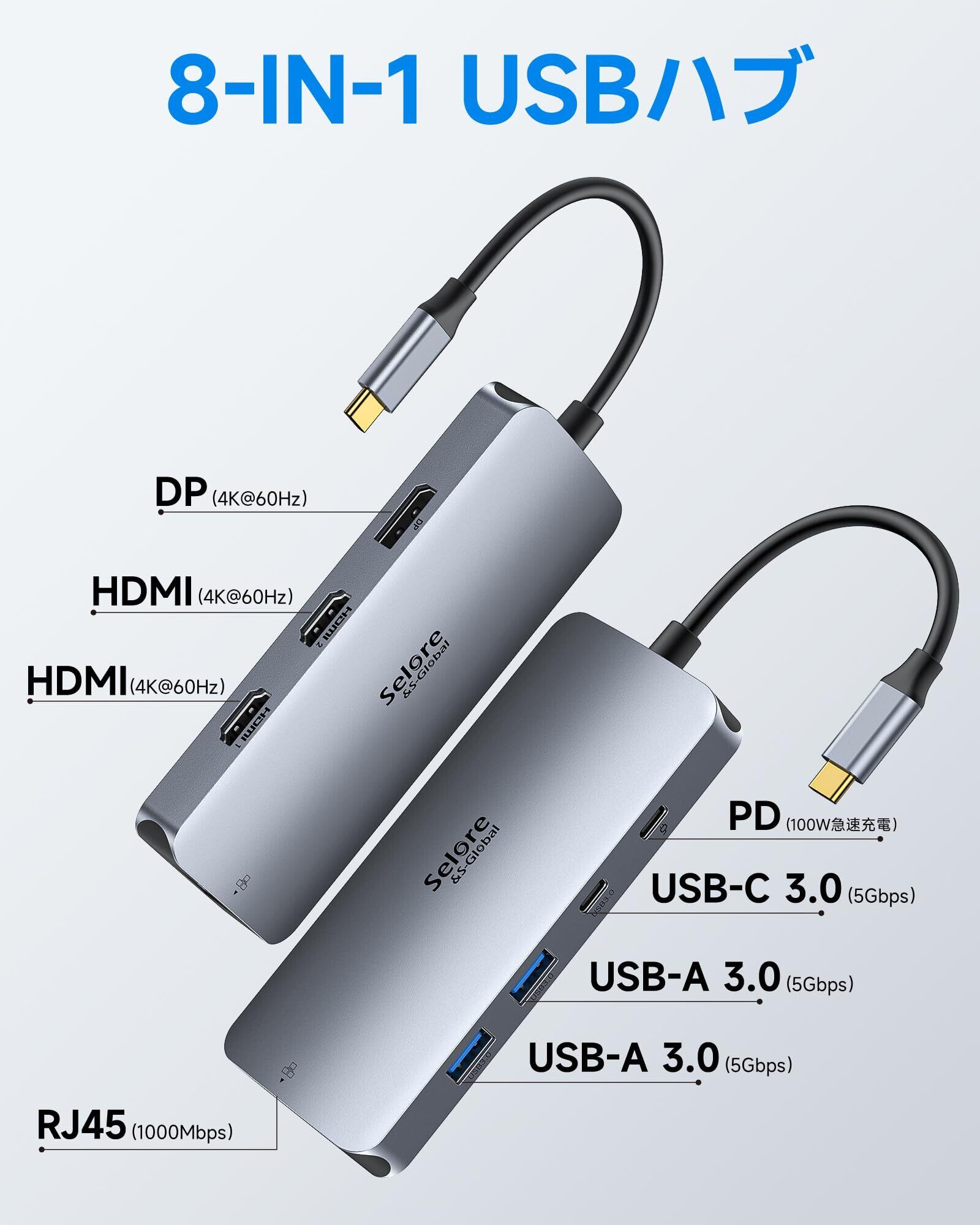 【在庫処分】Selore 8in1ドッキングステーション hdmi 2つ 4K対応 3画面出力 モバイルタイプ 100W 急速充電 Displayport LAN 2 USB-A/USB-C 3.0ポート usb ハブ type-c MacBook Pro/Air 2020 Dell/Lenovo Yoga HPなどタイプC機種に対応
