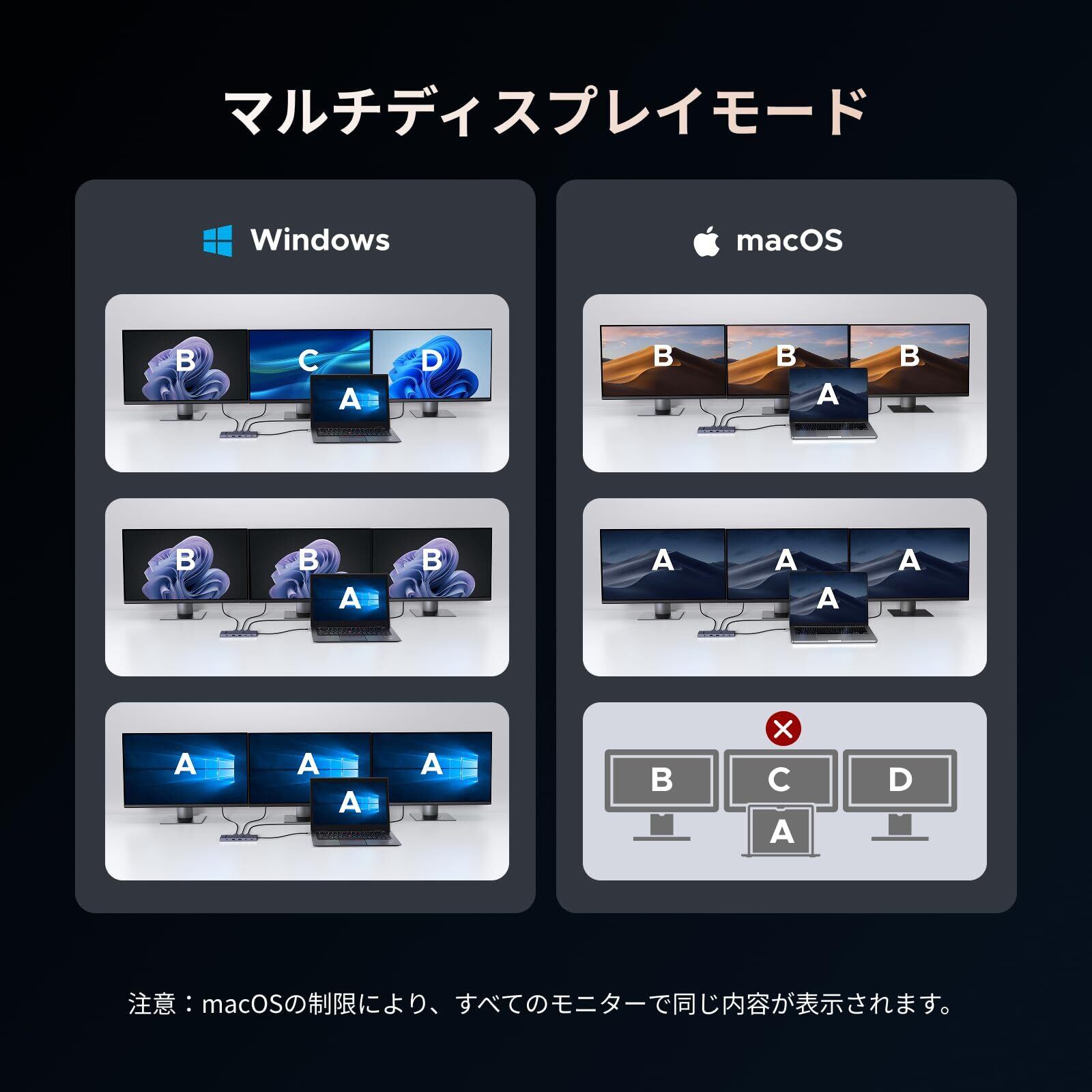 【トリプル4K解像度ドッキングステーション】: 2つのHDMIポートと1つのDPポートを備えたこのドッキングステーションは、シングルスクリーン4K 144Hz、デュアルスクリーン4K@60Hz、トリプルスクリーン4K@30Hzの超クリアな解像度をサポートし、仕事やエンターテインメントを強化します。