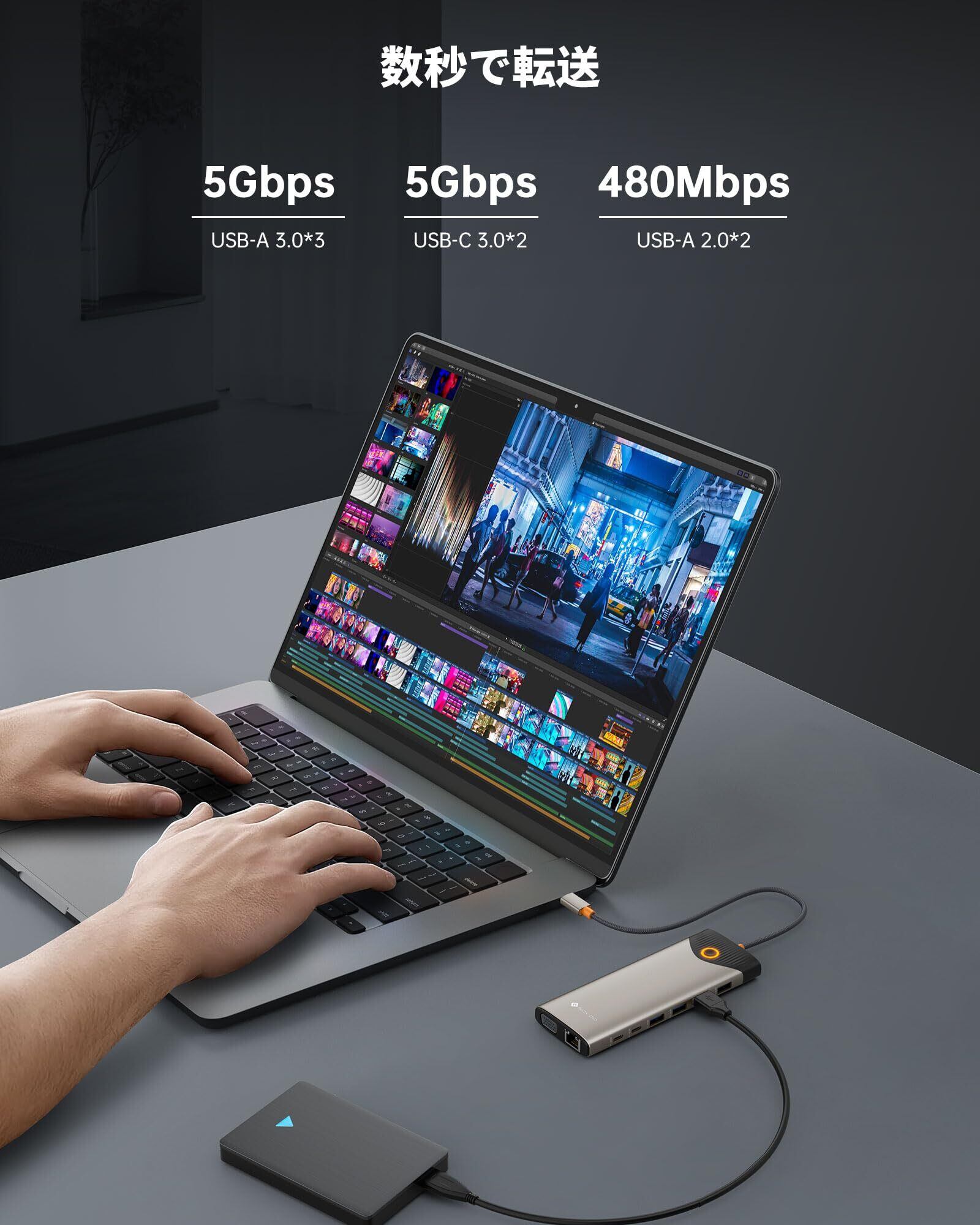 高速データ転送: USB 3.0およびUSB Cポートは、最大5Gbpsの速度でファイル、映画、写真を転送できます。USB 2.0ポートは、キーボード、マウス、その他のUSB-Aデバイスとのシームレスな接続を可能にします。さらに、USB-CドングルにはSDおよびTFカードスロットが内蔵されており、SDカードやMicro SDカードのファイルに簡単にアクセスできます。