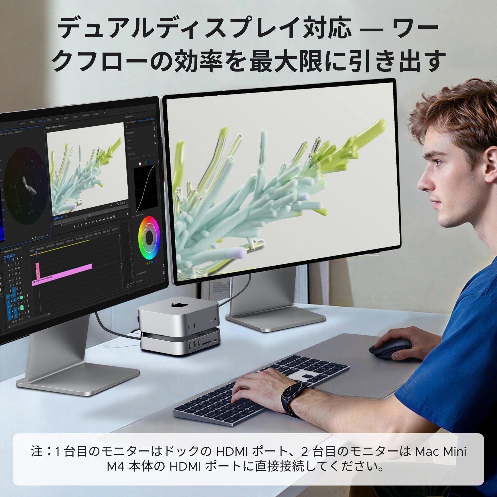【HDMI 2.1&USB-C DP1.4対応、デュアル高画質映像出力】: 本mac mini ドックは2つの上位USB-C端子(DP1.4規格対応)から高品位な映像信号を受信し、HDMI 2.1出力では最大8K@30Hz(M4 Pro)または4K@144Hzをサポート。2画面表示、HDRにも対応し、業務用途からエンターテインメントまで、滑らかで精細な視覚体験を実現します。
