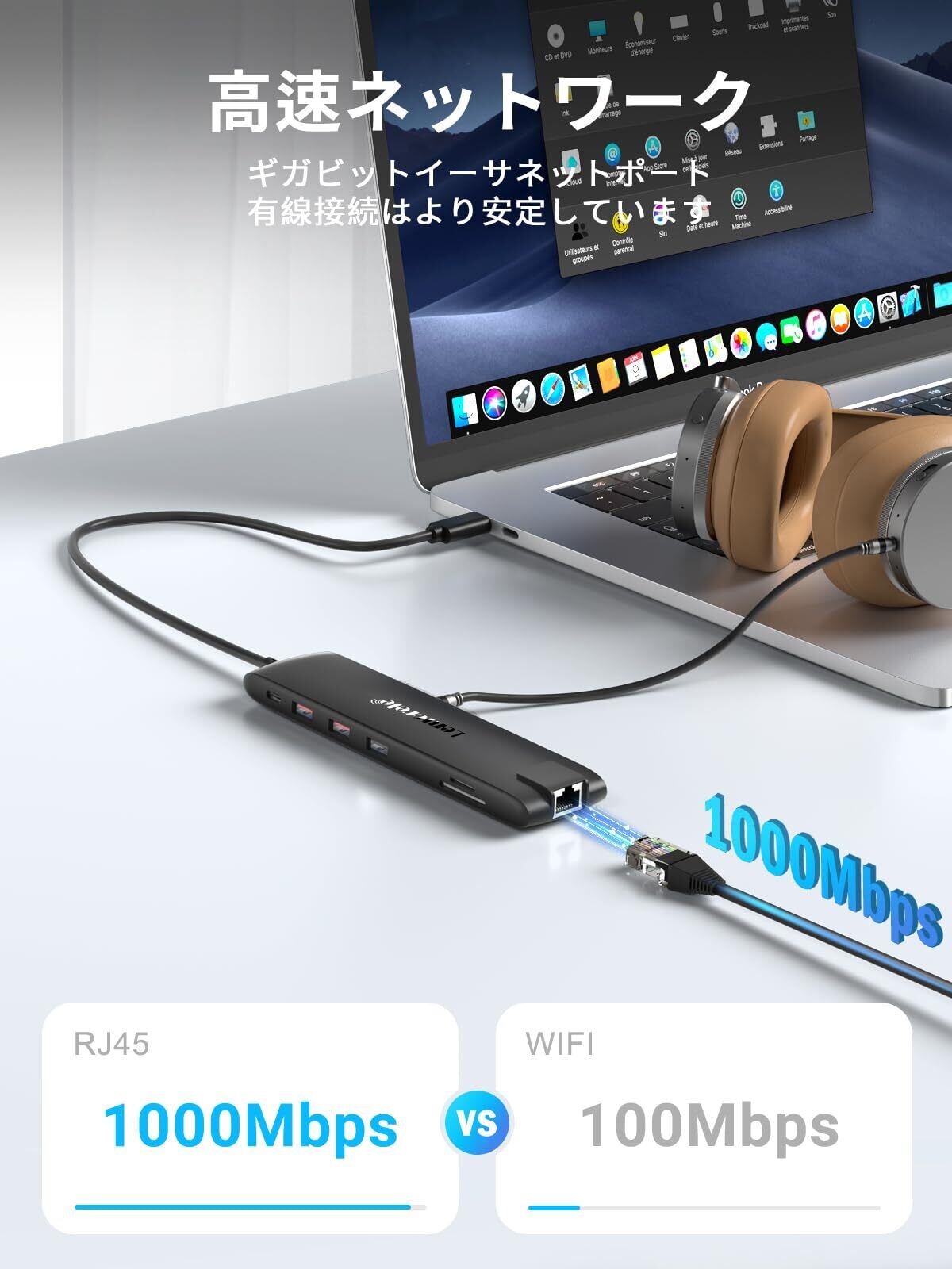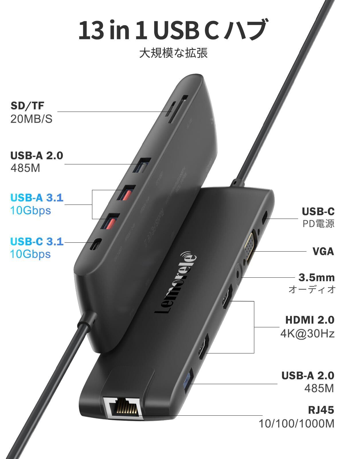 Lemorele USB-C 13-in-1ハブ:このハブは追加のドライバーを必要としません。つまり、プラグアンドプレイは、より多くの外部デバイスを接続したり、元のデバイス関数を拡張できるハブです。 エクステンダーは、1*100W高速充電ポート、1*VGA、1*3.5mmサウンドポート、2*HDMI(4K@30Hz)、2*2.0USB A、1*LAN、 1*SD、1*TF、2*3.1USB A、1*10G USB Cと13つのポートが1つのハブにまとまることで、マルチタスクが可能になりました。
