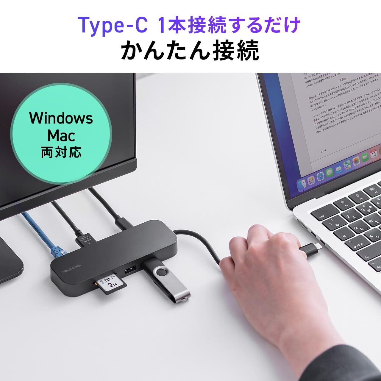 HDMI×1、 USBC ×1、USB A ×2、 タイプC ( PD 給電 専用)、 SD カード、 microSD カード、 有線LAN の合計8つの ポート を搭載しています。 TypeC ケーブル 1本を繋ぐだけの かんたん 接続です。難しいドライバーなどのインストールの必要もありません。