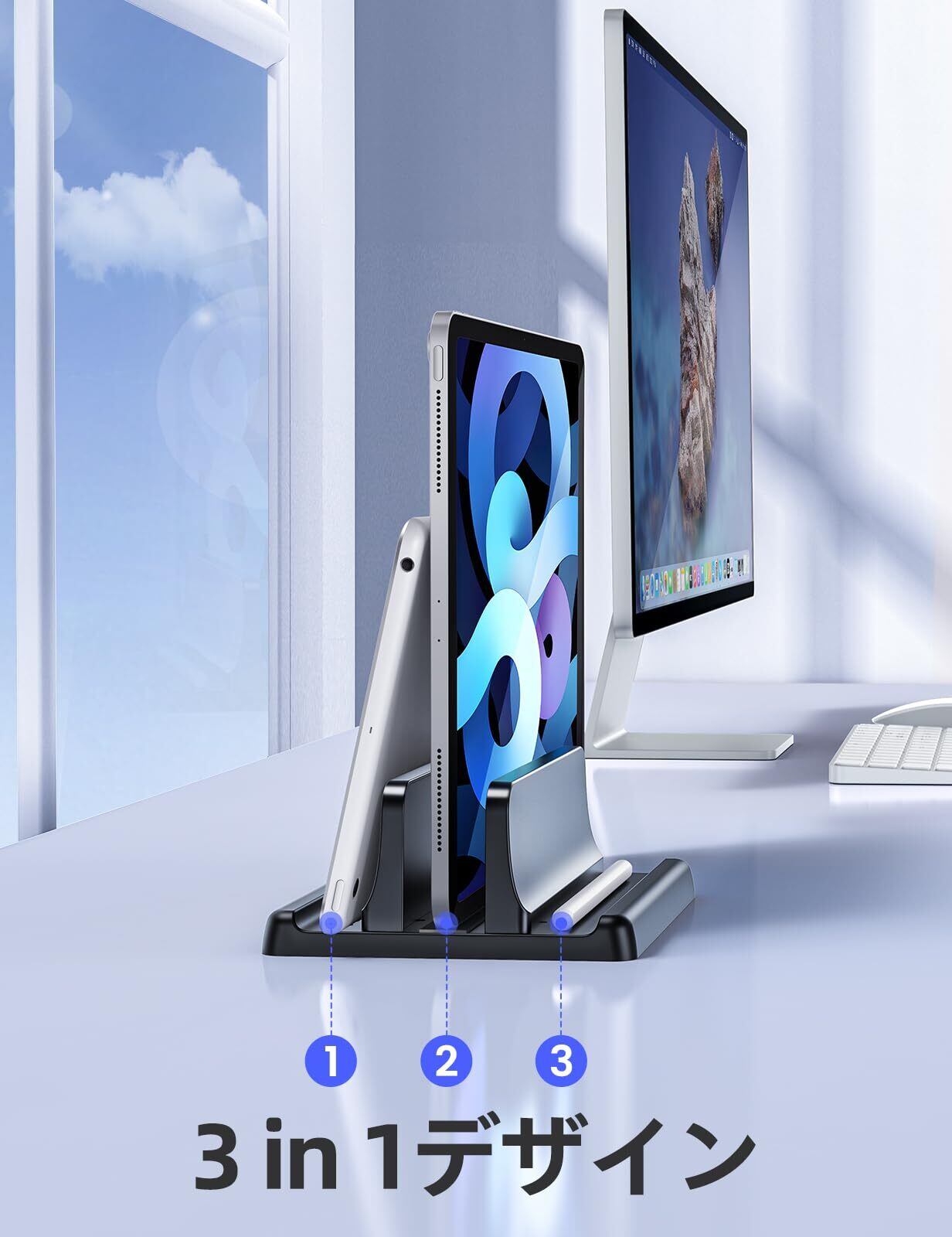 【3イン1デザイン】1 台のラップトップと電話または iPad を同時に垂直に立てます。 ラップトップ ホルダーは、スペースを節約し、デスク用にすっきりと整理されたスペースを構築するのに最適です。