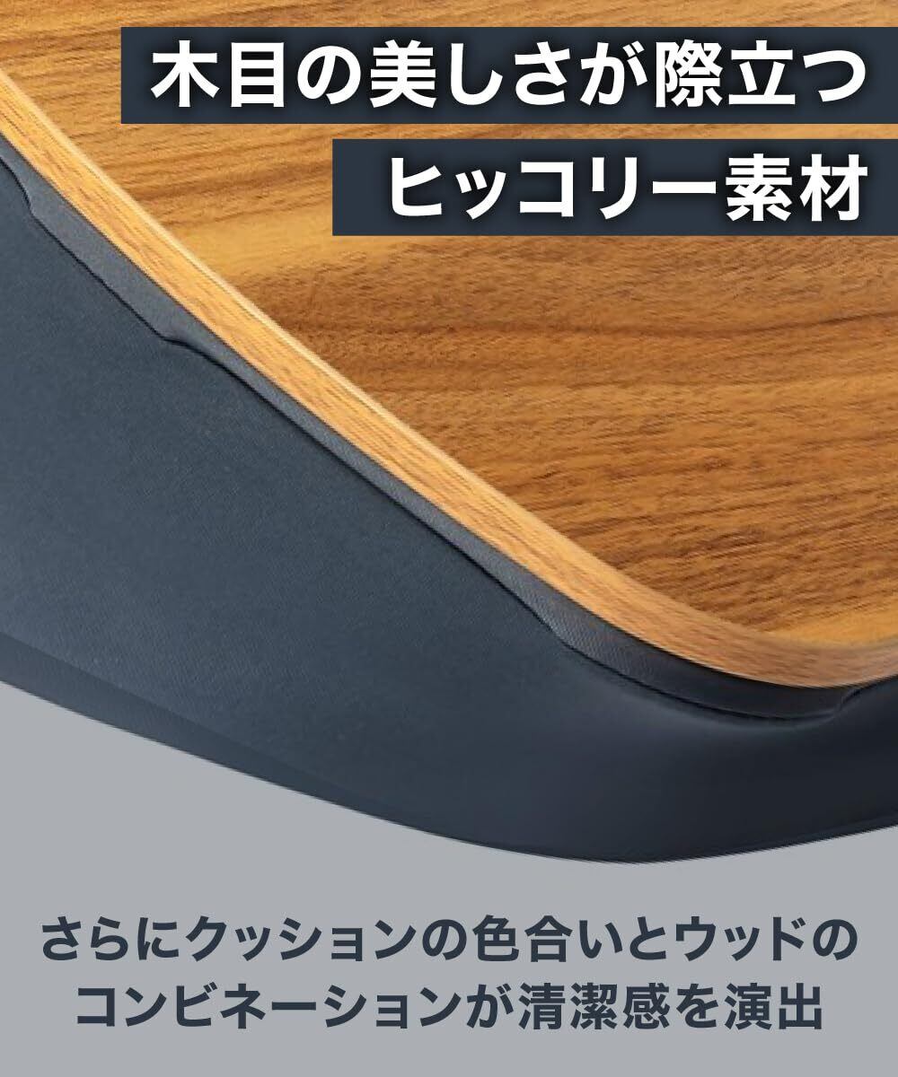 【 高級感あふれるデザイン 】天板には木製のヒッコリー素材を使用し、モダンでスタイリッシュなデザインを実現。木目の美しさが際立ち、強度にも優れているため、傷や汚れにも強く、長く美しい状態を保てます。インテリアに馴染む洗練されたデザインで、リビングやオフィスでの使用にも最適。クッションの色合いとウッドのコンビネーションが、清潔感を演出します。