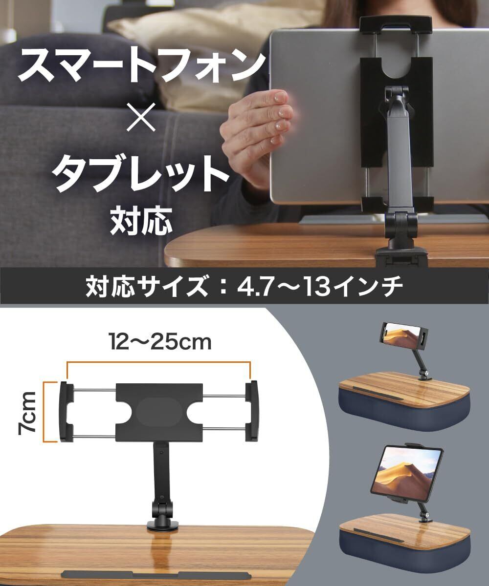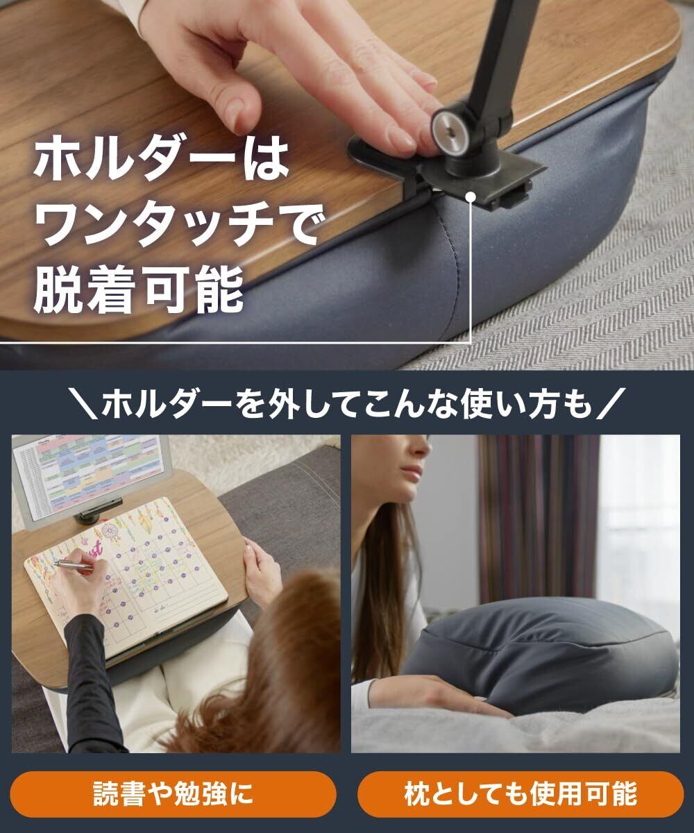 【 スマホ・タブレット・ノートPC対応で実用性抜群 】スマートフォンやタブレットを装着できる取り外し可能なホルダーが付属。必要な時だけ差し込んで使うことができ、動画視聴や資料確認など、あらゆるシーンで活用できます。 ホルダーによって目線が上がり、猫背や前かがみの姿勢を改善。首や肩周りに疲れ、目の負担を減軽できます。 また、天板手前にはシリコン製の滑り止めパッドを搭載しているため、ノートパソコンを載せても滑り落ちる心配がなく、安心して作業に集中できます。