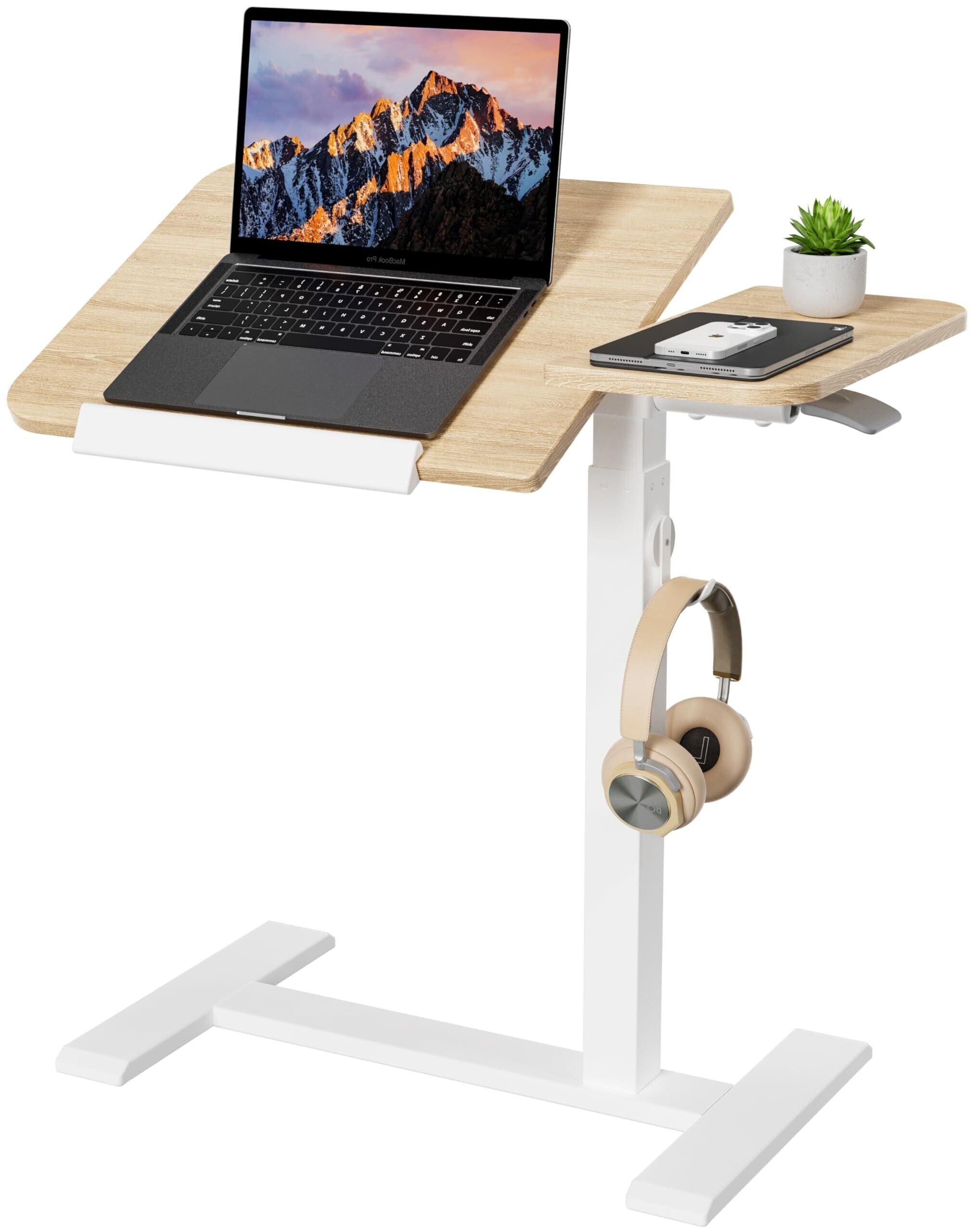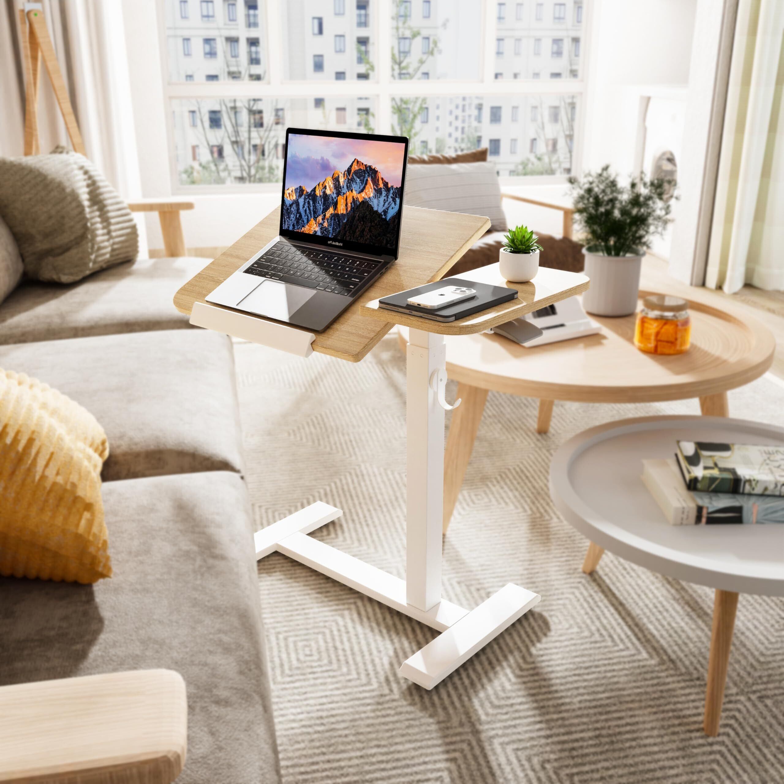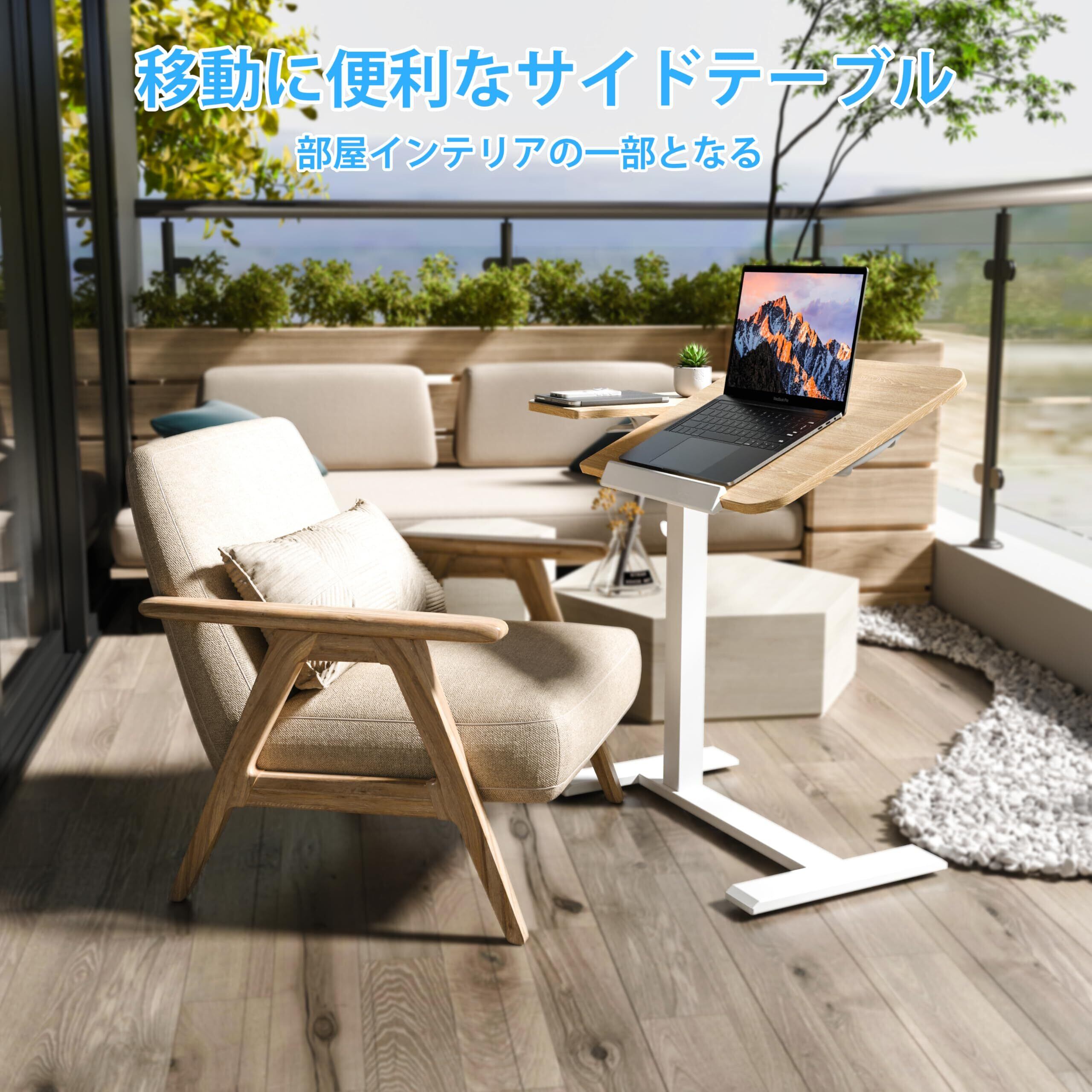 ETHU 角度調整サイドテーブル 昇降式ベッドテーブル 薄形キャスター付き 幅70.5cm ガス圧式無段階高さ調節 68~101cm ソファテーブル スタンディングデスク フック付き
