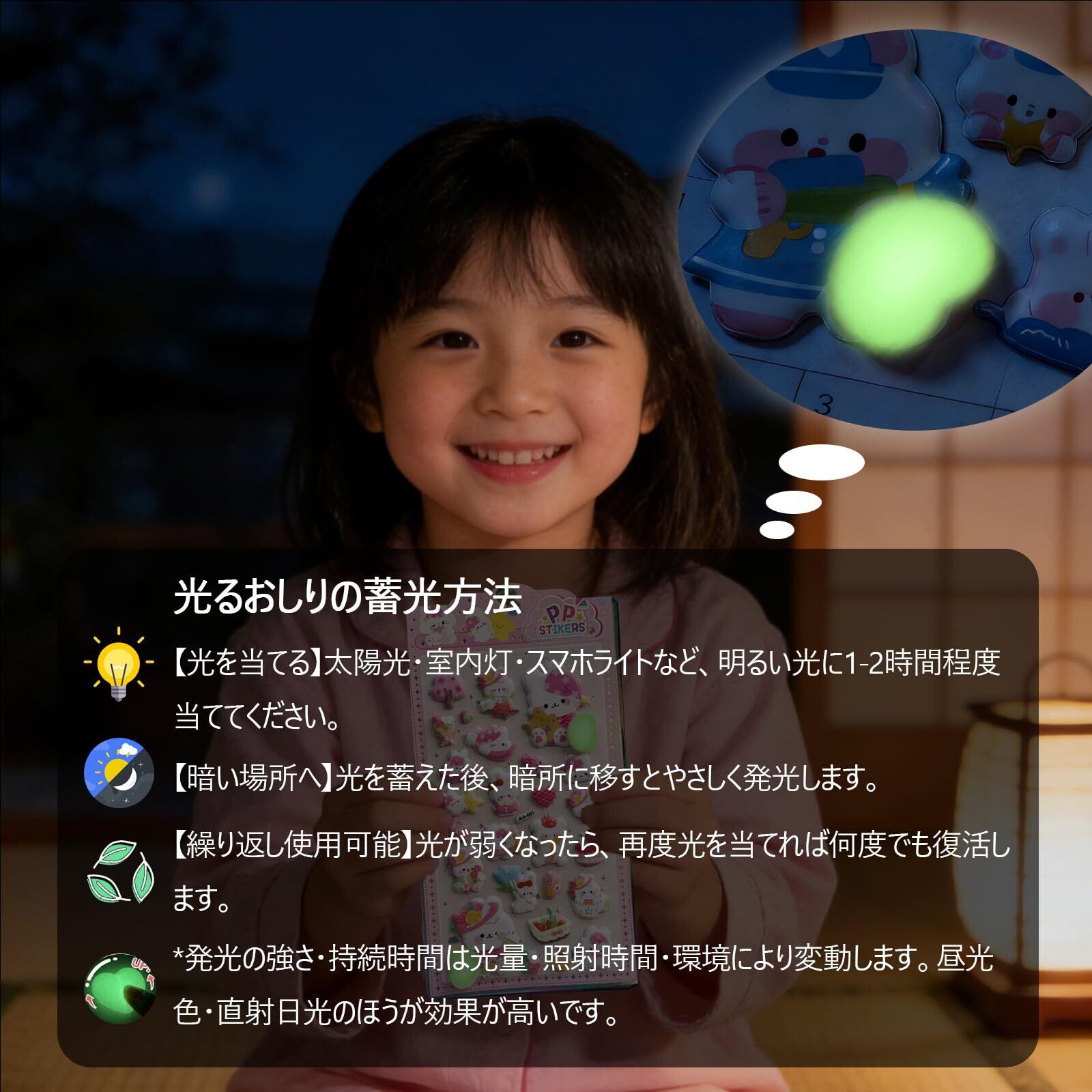 【光るおしりの蓄光方法】光を当てる:太陽光・室内灯・スマホライトなど、明るい光に1-2時間程度当ててください。暗い場所へ:光を蓄えた後、暗所に移すとやさしく発光します。繰り返し使用可能:光が弱くなったら、再度光を当てれば何度でも復活します。*発光の強さ・持続時間は光量・照射時間・環境により変動します。昼光色・直射日光のほうが効果が高いです。