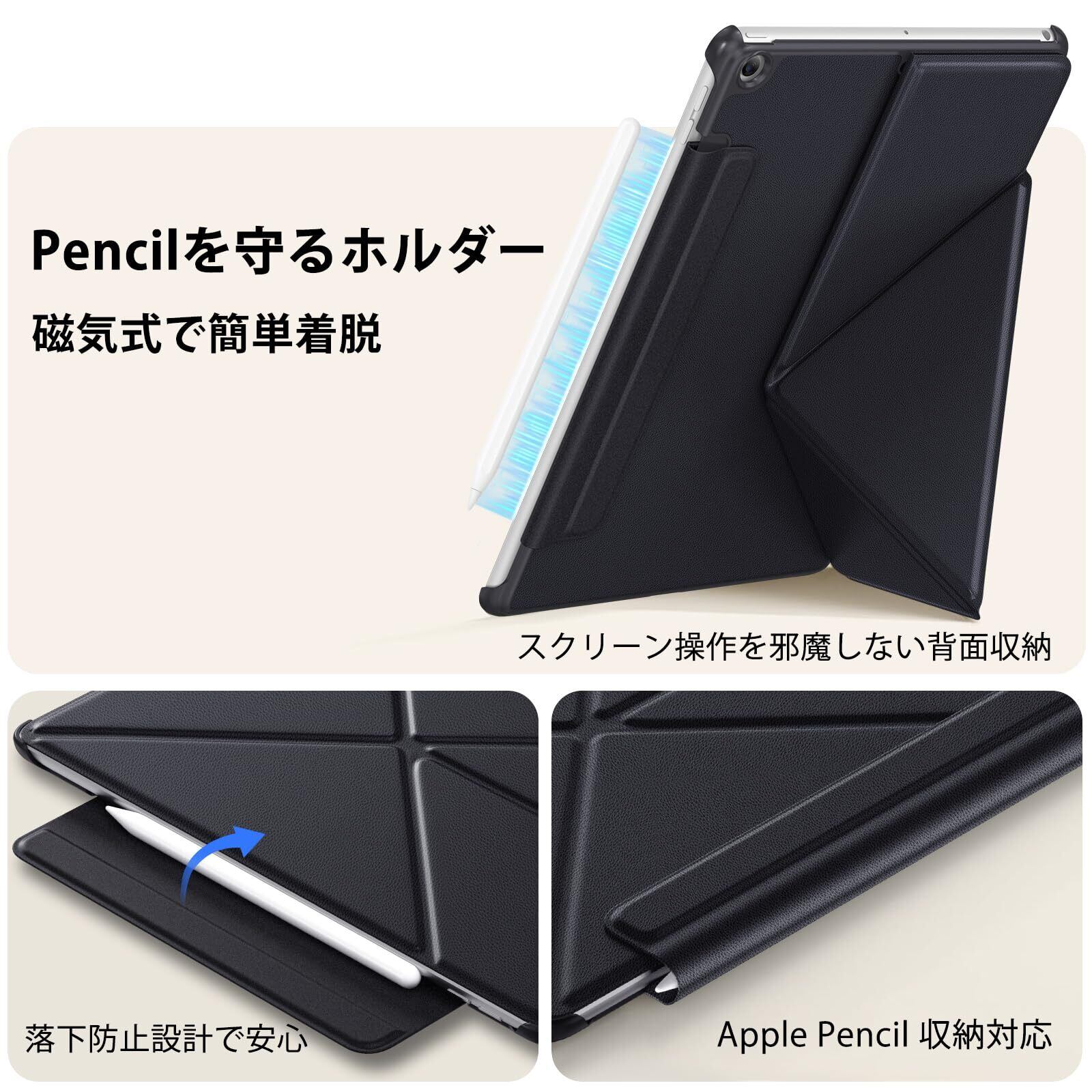 【高品質PUレザー&Apple Pencil収納対応】高級感のあるPUレザー素材を採用し、肌触りが良く、傷・水・汚れに強い仕上げ。内側は起毛加工で画面を優しく保護。さらに、Apple Pencil対応収納バンドを背面に搭載。未使用時は折りたたんでスッキリ収納できます。機能性と美しさを兼ね備えたiPad用レザーケースです。