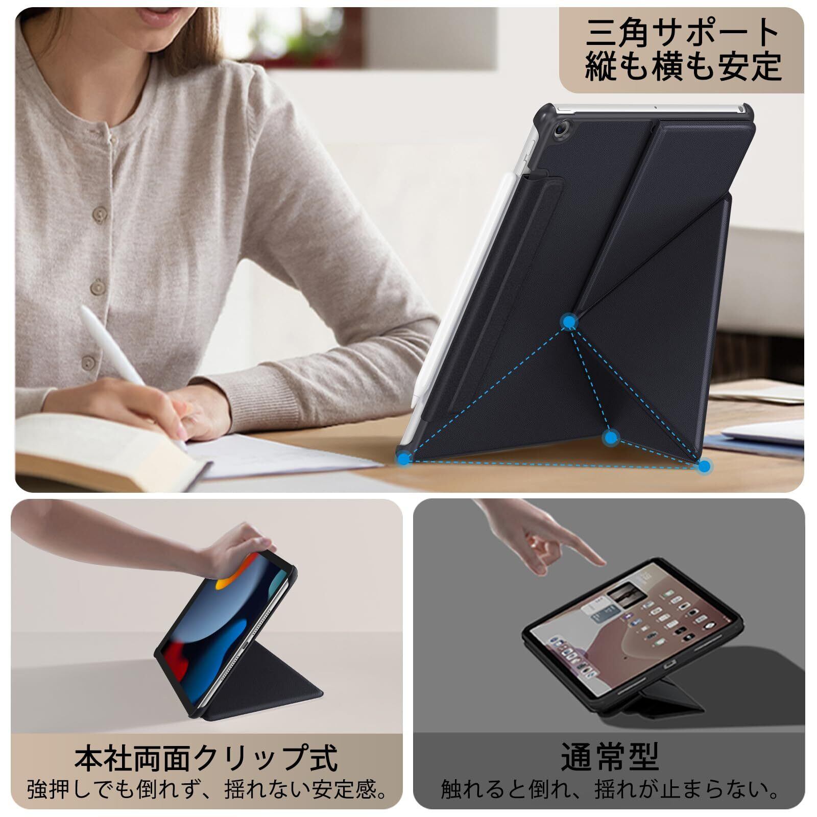 【縦置き&横置き両対応|安定感抜群のスタンド機能】iPadを縦向き・横向きどちらでもしっかり立てられる2WAYスタンドケース。三角形構造による優れた安定性で、倒れにくい縦置きスタンドを実現しました。動画鑑賞やタイピング、イラスト作成、WEB閲覧、オンライン会議まで幅広く活躍。まるで折り紙のような洗練デザインで、4段階の角度調整も可能。iPadスタンド付きケースをお探しの方におすすめです。