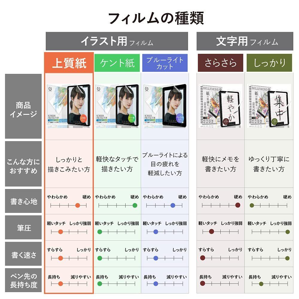 【BELLEMOND「紙感覚」とは】:紙感覚はBELLEMONDが2019年より販売している日本国内製造ペーパータイプフィルムです。紙と鉛筆を使った時のような摩擦係数を追求し、紙のような描き心地を再現しています。iPadをキャンバスにしてイラストを描く、学校でのノート代わりに使う等、iPadをもっとクリエイティブに使うためのフィルムです。