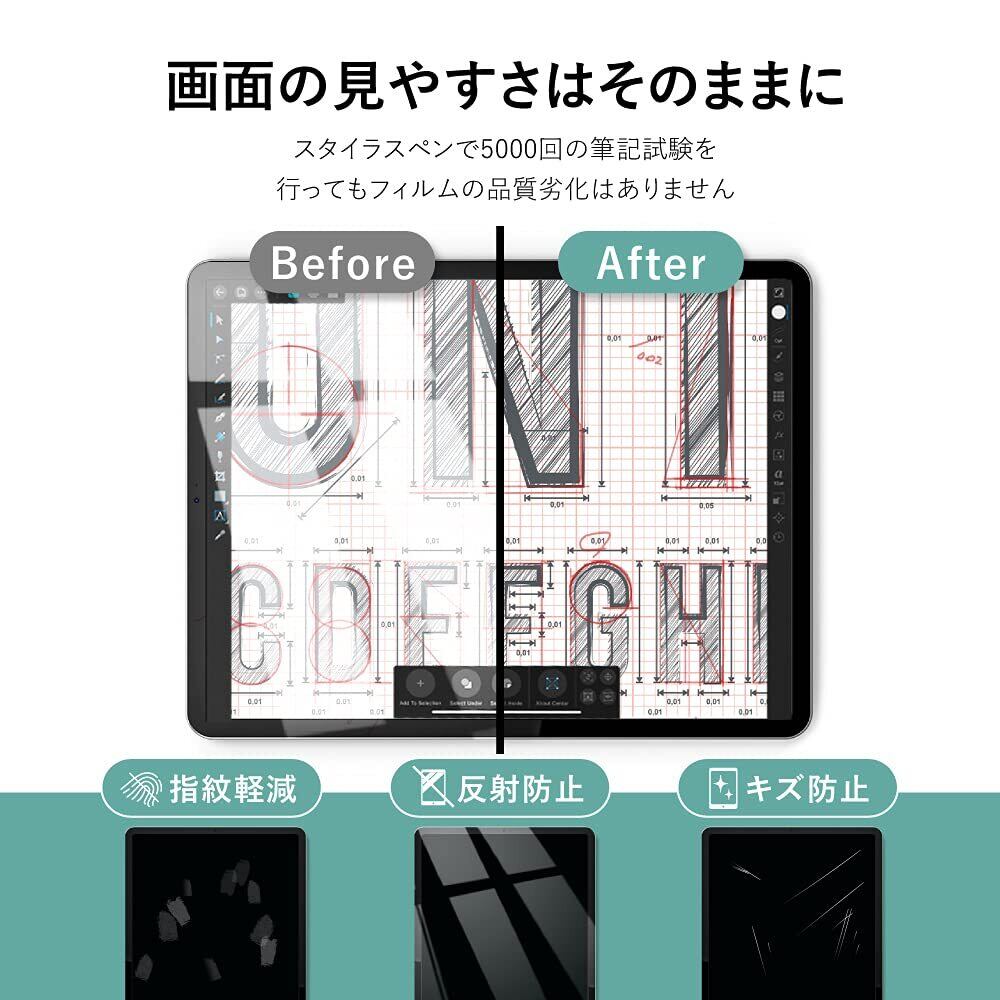 【ペン先摩耗低減】:特殊コートにより、ペン先摩耗度を従来の50%に軽減しております。【反射防止】:アンチグレア加工で光の反射や映り込みを防止します。【表面硬度3H】:3Hの鉛筆でひっかいても傷がつかない硬度で、画面への傷を防止します。【耐久性】:500gのスタイラスペンでの耐擦傷性試験にて、5000回の試験を行っても品質の劣化は認められませんでした。