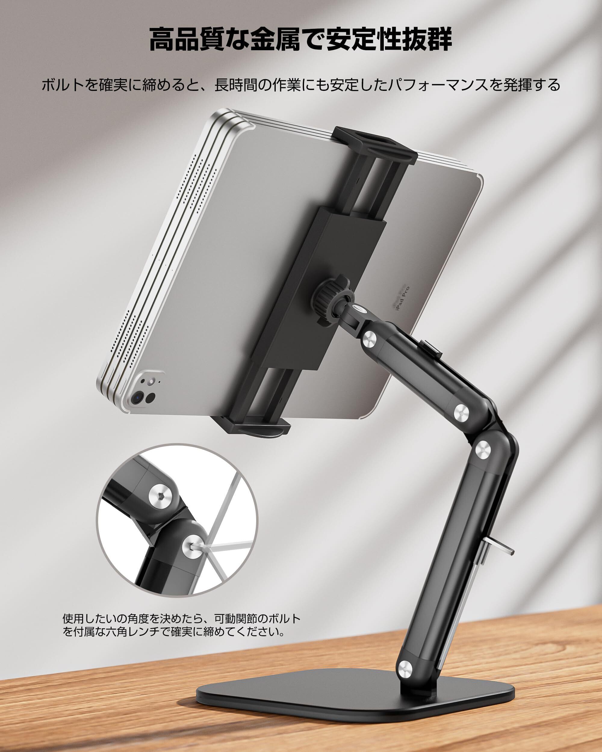 タブレットスタンド 卓上 iPad置き台 4つ関節調整 耐荷重1.5KG 360度回転 アルミ製 横/縦置き 4.7-15.6インチ対応 高さ調整 角度調整 スマホ/タブレット/モバイルモニタ対応