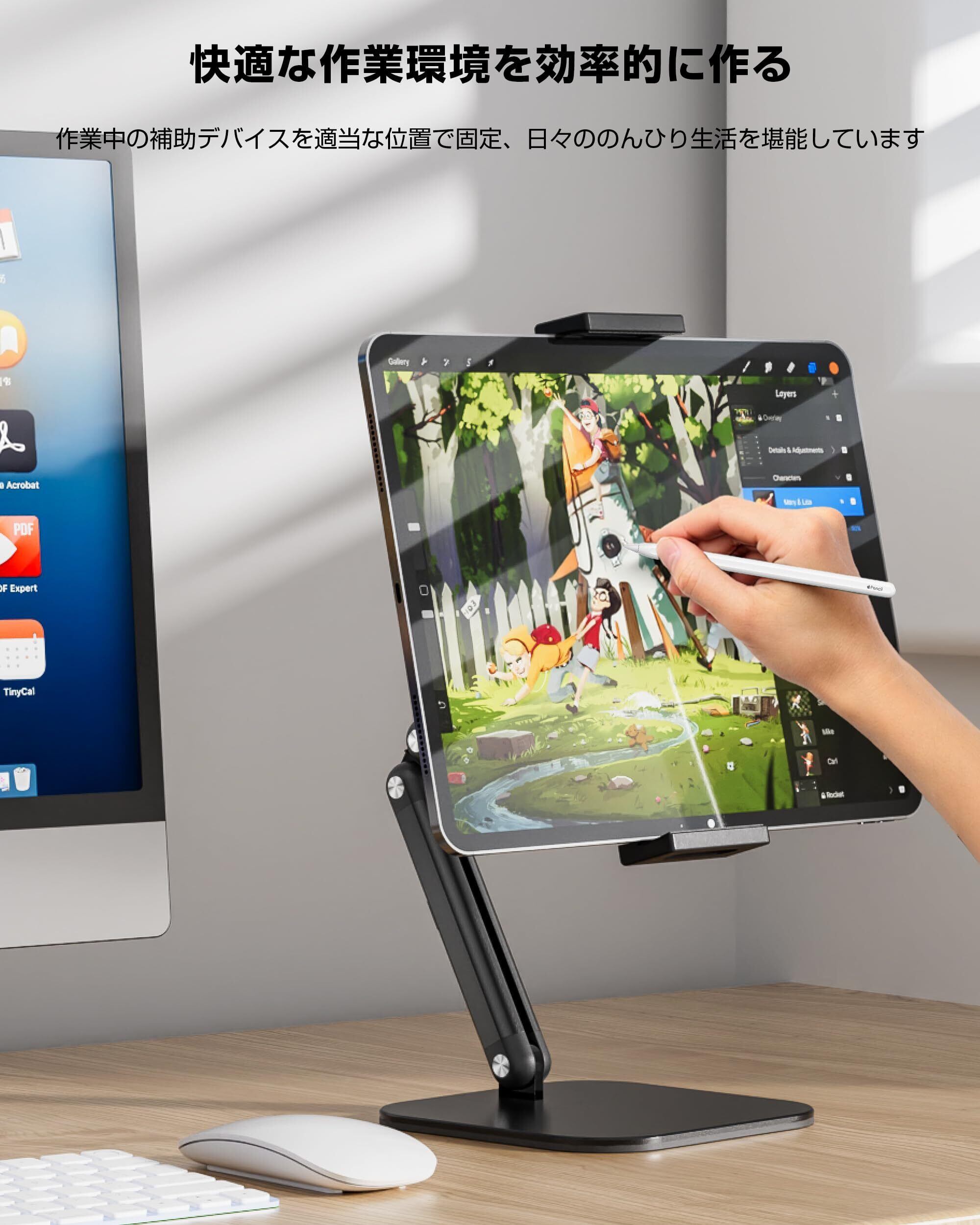 「タブレットスタンド・折り畳み式」本製品は4つ可動関節を採用しており、広い可動域を持つ電子機器用卓上アームスタンドです。高さや角度を無段階で調節できるため、作業内容に合わせて位置を調整できるので、長時間座っていても首や肩への負担を軽減できます。それにも、ボールジョイントにより、クリップホルダー部分が360度に回転可能、簡単に縦横切り替えることができるので便利になります。なお、折りたたみ式で、使わない場合には、アームを折り畳えば場所をとらないので、空間を有効に活用できます。