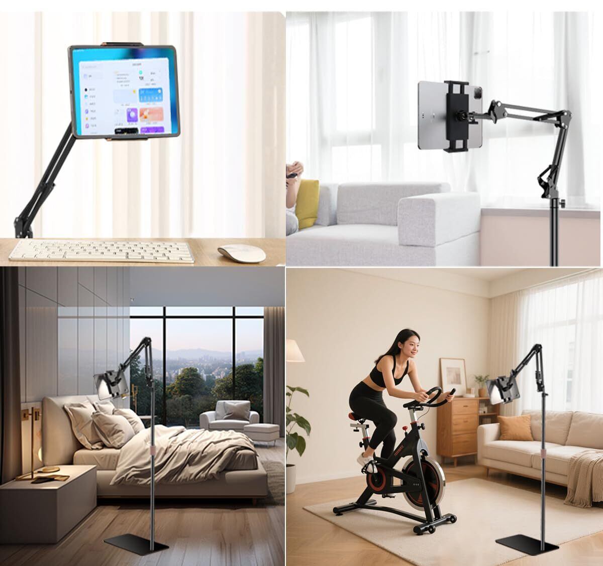 【各種の場合で利用可能】オフィス、寝室、キッチン、バスルームなどいろいろな場所に適用。日常映画鑑賞がもちろん、エクササイズ、店頭、展示会ブース、受付の案内などに幅広くお使いいただけます。 高品質アルミ合金台座とハイプと炭素鋼アームで全体的金属製、堅固なアルミアームのスタンドは超強いスプリングを備えるので、頑丈で揺れなく、安定性が抜群です。タブレットを挟む用クリップ内側は上質なスポンジマットを備えて、更に台座底部もスポンジマットを用意し、使用時に安定性が高くてタブレットと床を損なわないです。