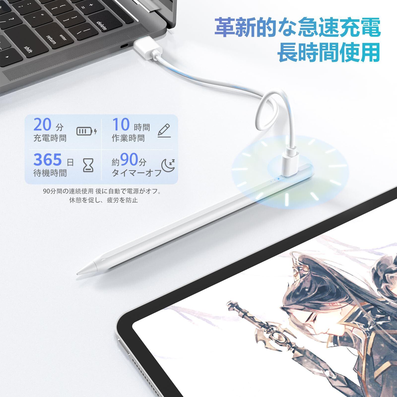 【2倍高速充電&LED残量表示】ipad ペンのバッテリーは高速充電に対応しているので、15分間の充電で約7時間使用できます。ipadペンは20分フル充電で10時間継続使用可能となります。90分間放置すると自動オフし、疲労対策に。LED残量表示により、バッテリー残量の目安がわかるため、いつ充電すれば良いかわかりやすい。