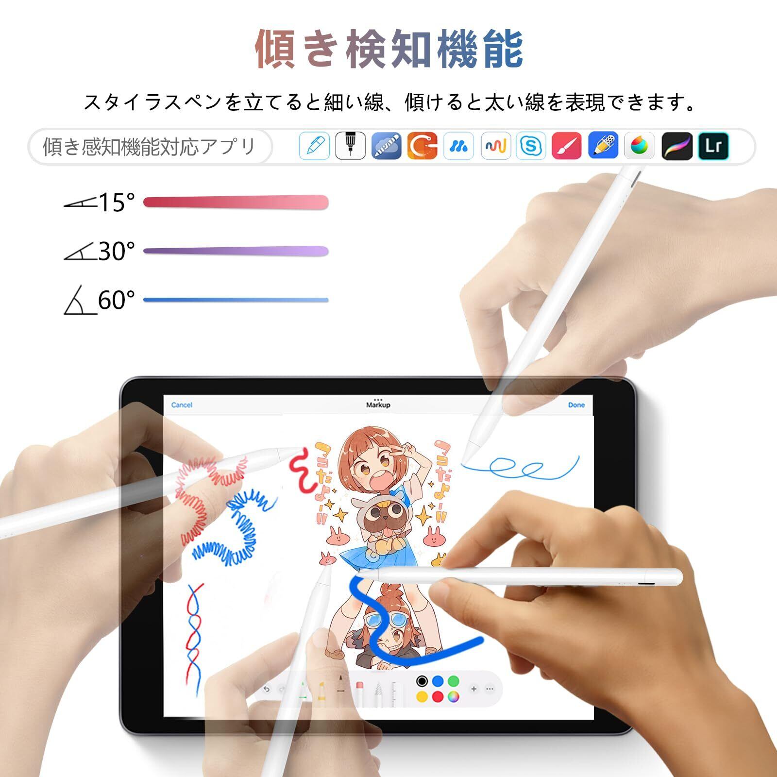 【傾きを感知する機能&操作便利】面倒な設定は不要で、 ipadタッチペン の上部を軽くタップして電源をオン/オフにして、非常に簡単です。 アップルペンシル の傾きを感知する機能が備わっており、ペン先の傾斜面積に応じて線の太さが変化します。(ご注意:傾き感知機能対応ソフト:SketchBook、Procreate、Paper、Noteshelf )