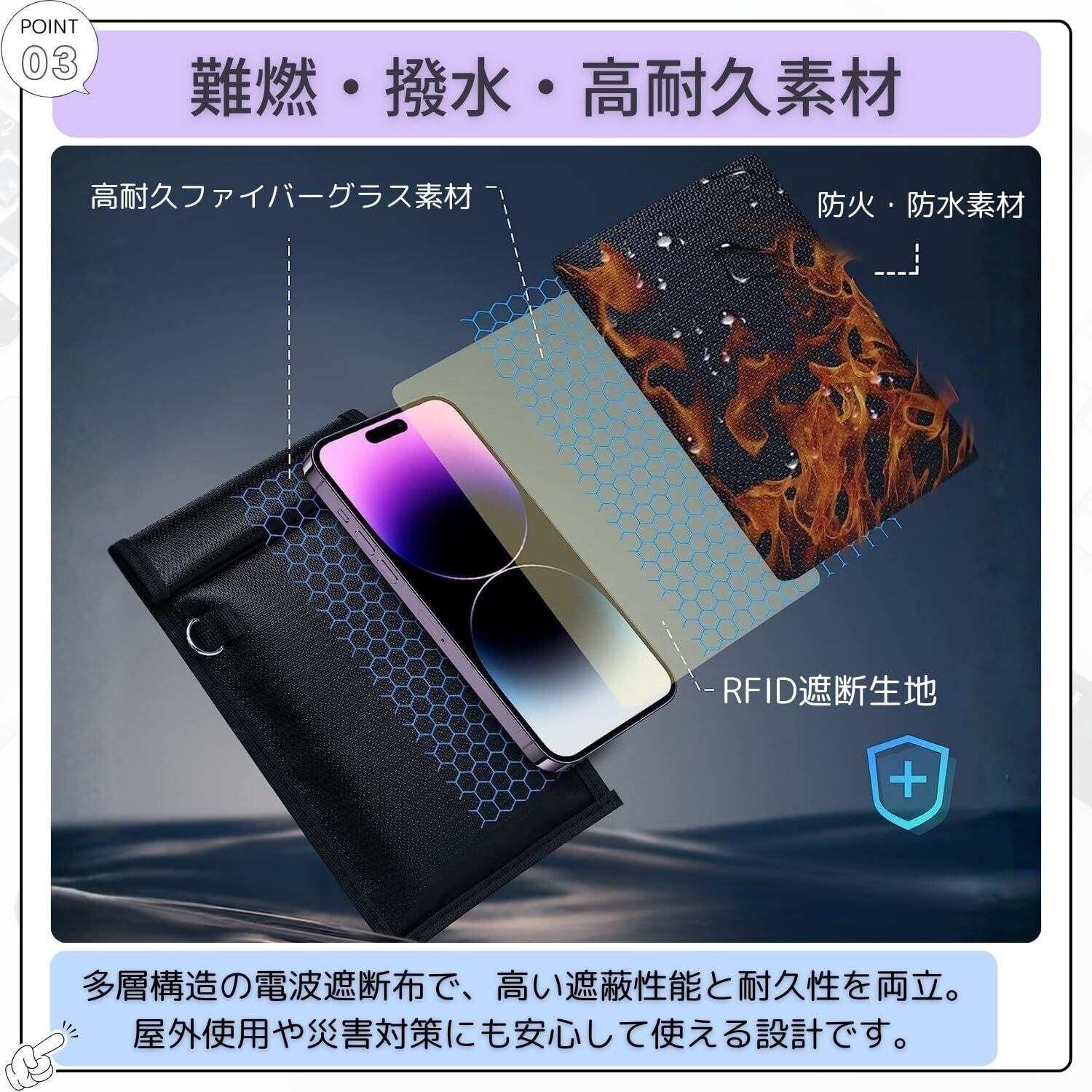 【難燃・撥水・高耐久素材】本製品の外層には、耐摩耗性・耐熱性に優れたガラス繊維素材(グラスファイバー)を採用。火の粉がかかっても燃え広がりにくい難燃性を備え、表面は撥水加工済みで水濡れにも対応します。内層は多層構造の電波遮断布で、高い遮蔽性能と耐久性を両立。屋外使用や災害対策にも安心して使える設計です。